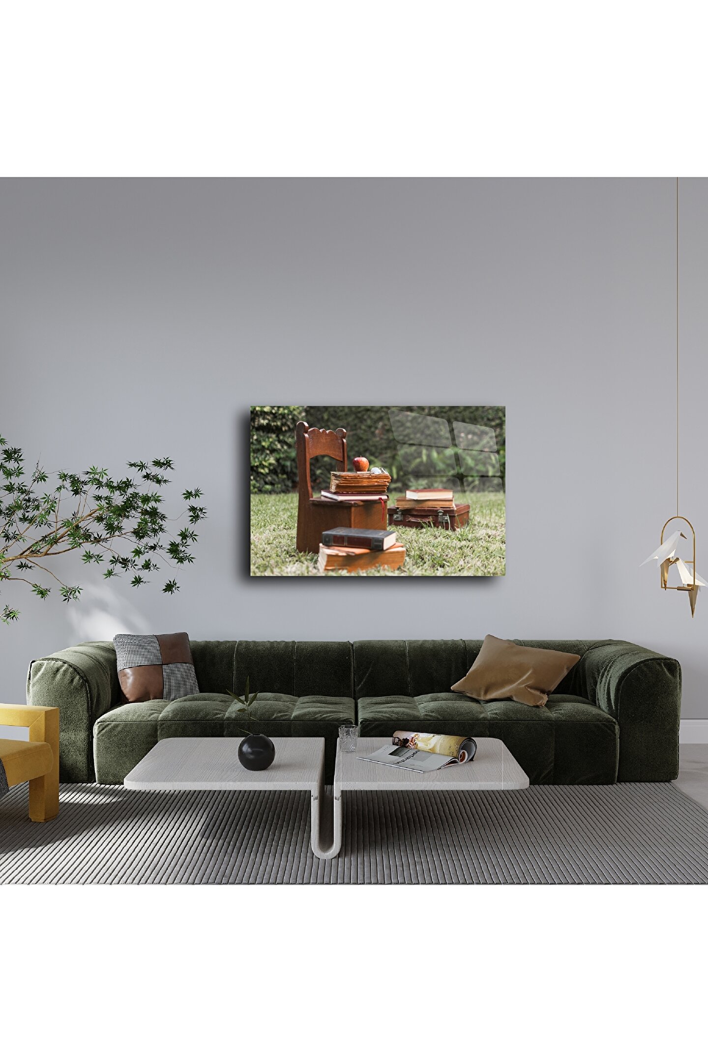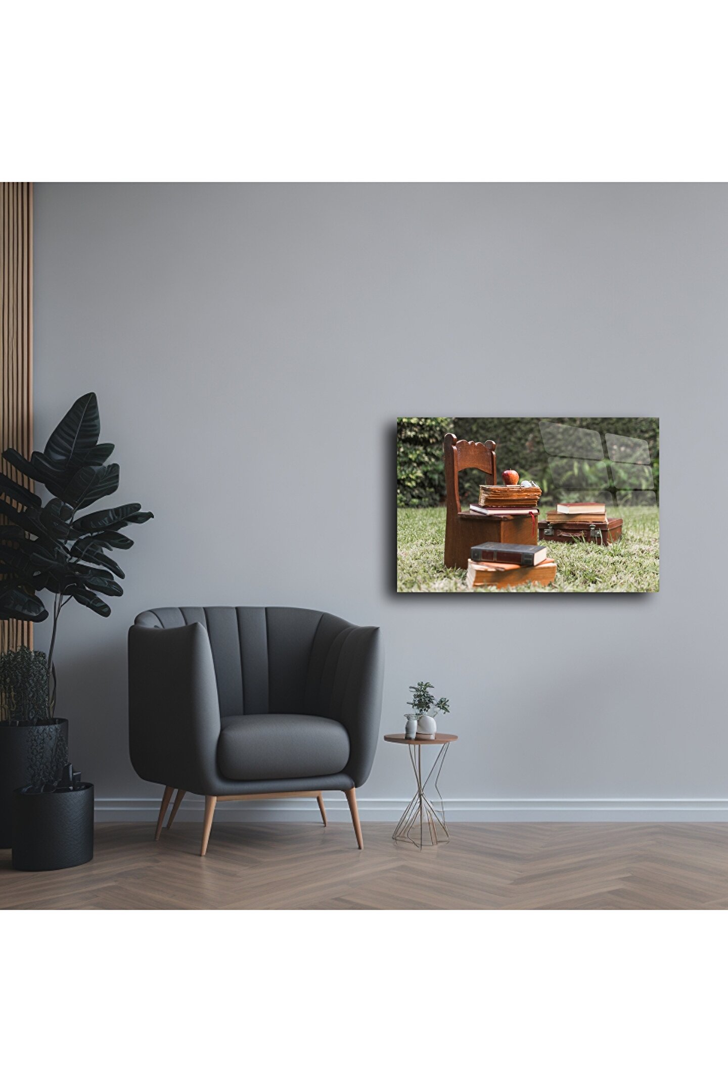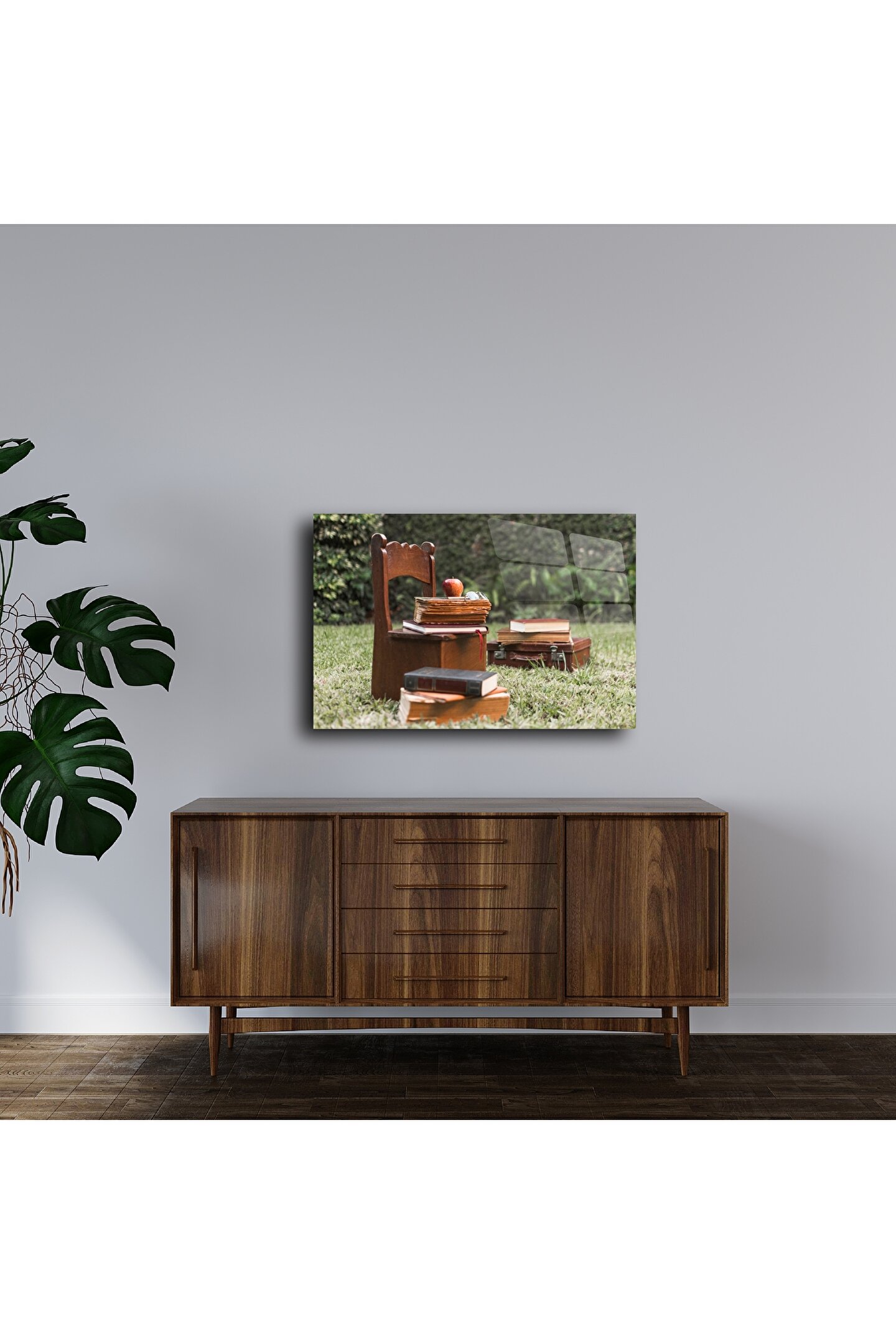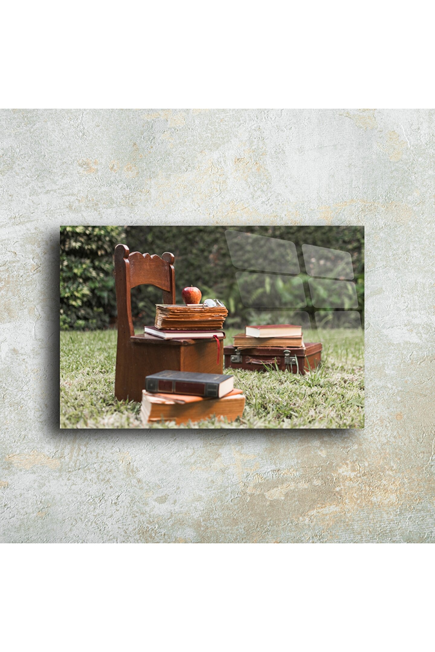 Sıcak bir yaz günü bahçede bırakılmış eski kitaplar, küçük bir sandalye ve kırmızı bir elma… Bu cam duvar tablosu, nostaljiyle dolu bir hikâyeyi evinize taşır. Kitap kokusunu, çocukluğunuzu veya bir öğretmenin ilham dolu anılarını hatırlatır. Cam yüzeye baskılanan bu kare, her ışıkta canlılığını korur ve ruhunuza huzur verir.