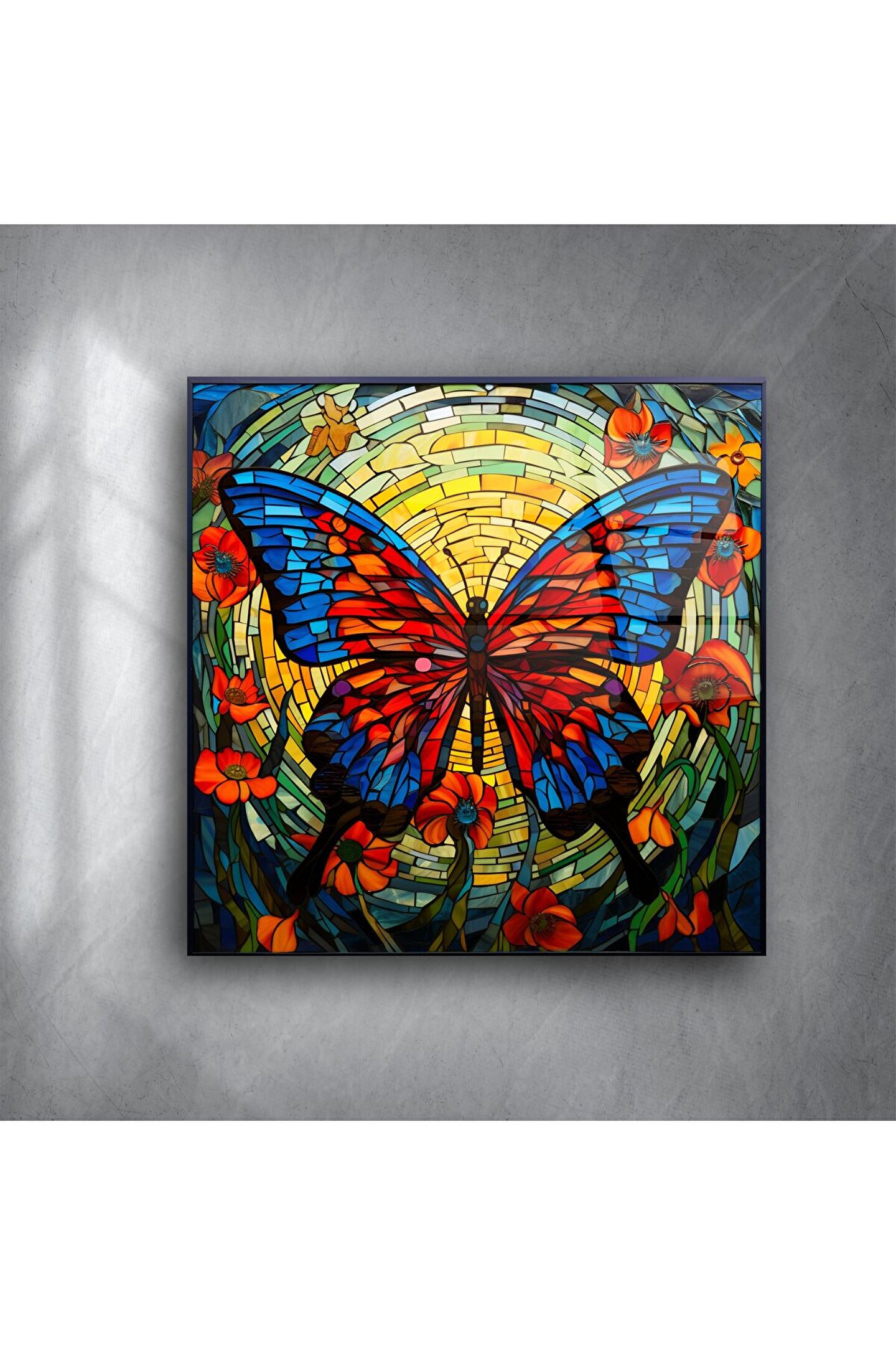 Bu göz alıcı kelebek temalı cam tablo, yaşam enerjisini yansıtan parlak renkleri ve vitray tarzı tasarımıyla duvarlarınıza sanatsal bir şölen getiriyor. Sarı güneş dairesi, mavi-kırmızı kanatlar ve çiçekli çevre kompozisyonu, iç mekânlara sıcaklık ve dinamizm katar.