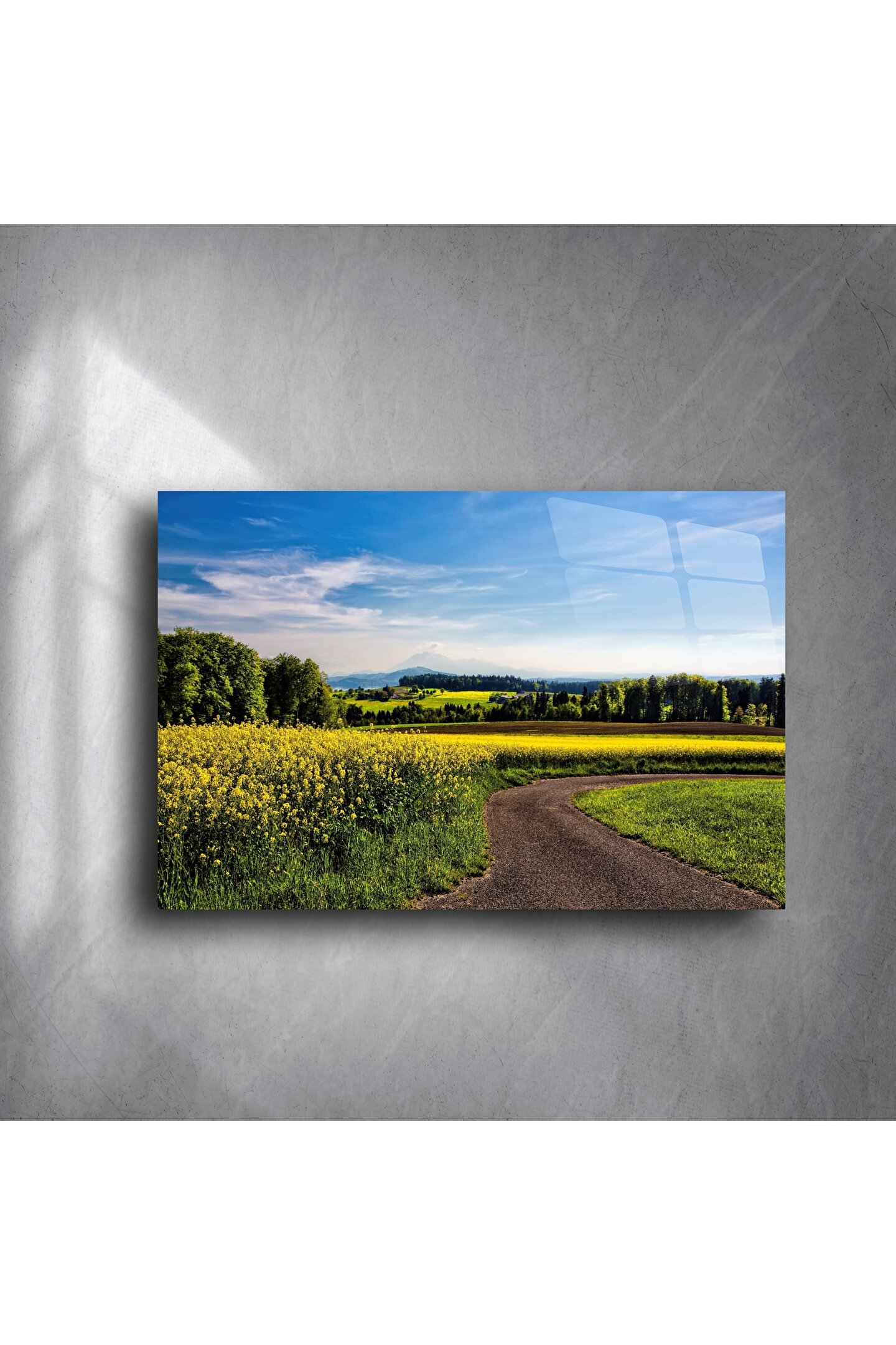 Göz alıcı sarı çiçek tarlaları arasında kıvrılan sakin bir yol ve uzaklarda silüet gibi yükselen dağ manzarası bu cam tabloda birleşiyor. Parlak cam yüzeye baskılanmış bu doğa sahnesi, bulunduğu ortama canlılık, pozitif enerji ve görsel derinlik kazandırır.