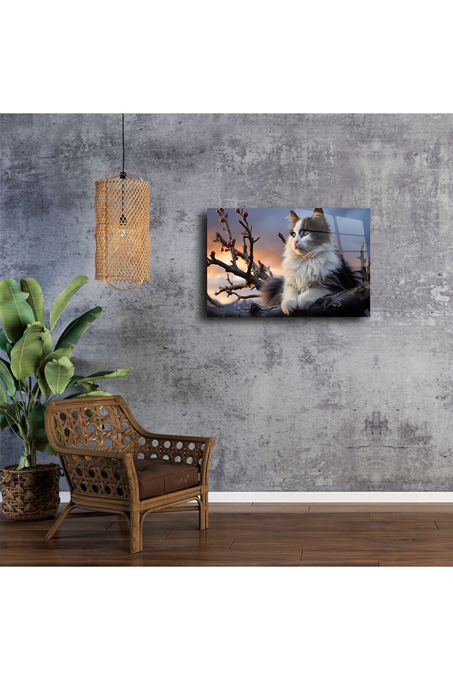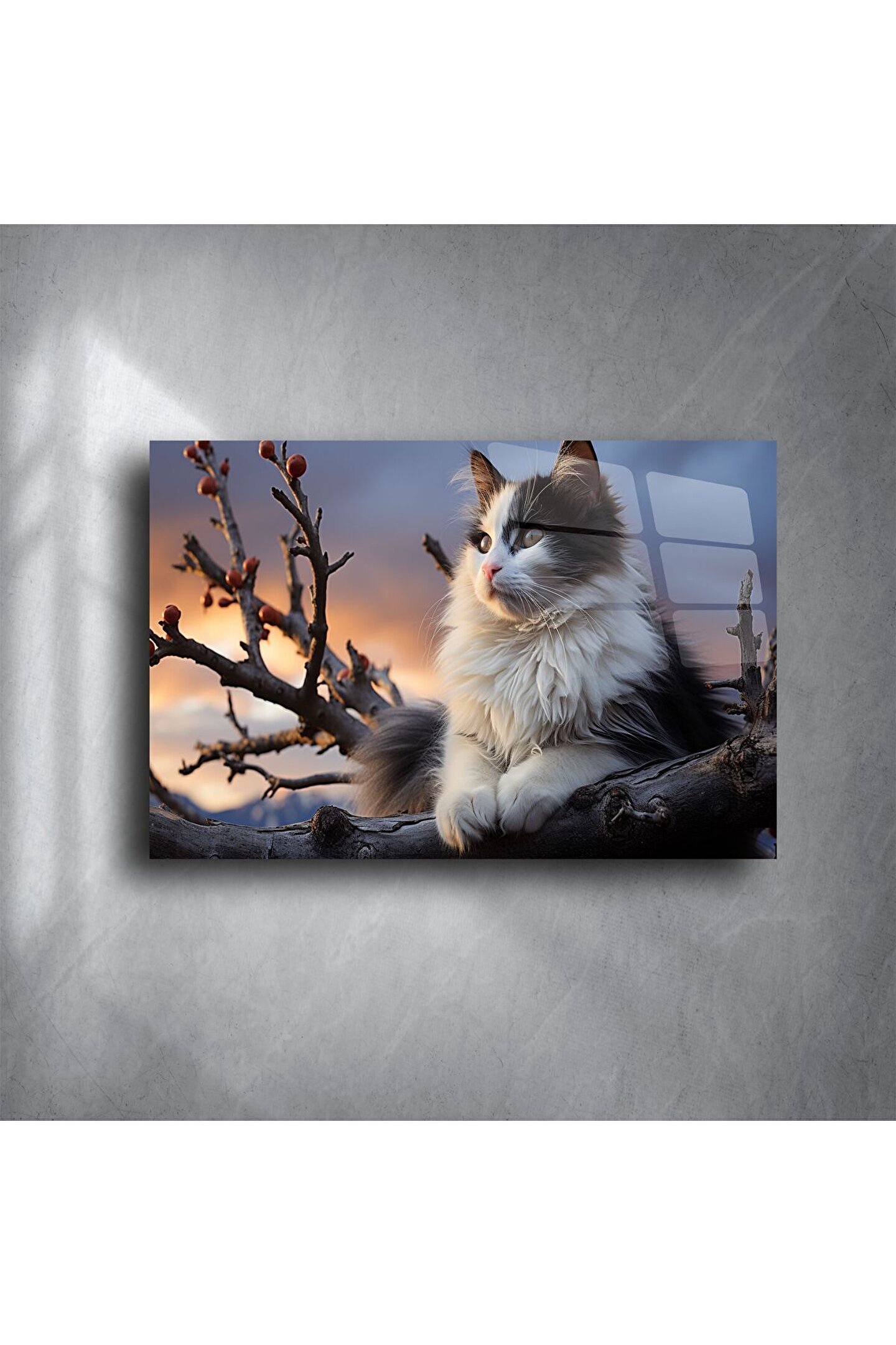 Bu büyüleyici duvar sanatı, gün batımında ağaç dalına konmuş tüylü beyaz gri bir kediyi canlı cam baskı kalitesinde sunuyor. Sıcak tonlar ve doğadan ilham alan kompozisyon, iç mekâna huzur ve zarafet katarken, gerçekçilik hissiyle dikkat çekiyor.