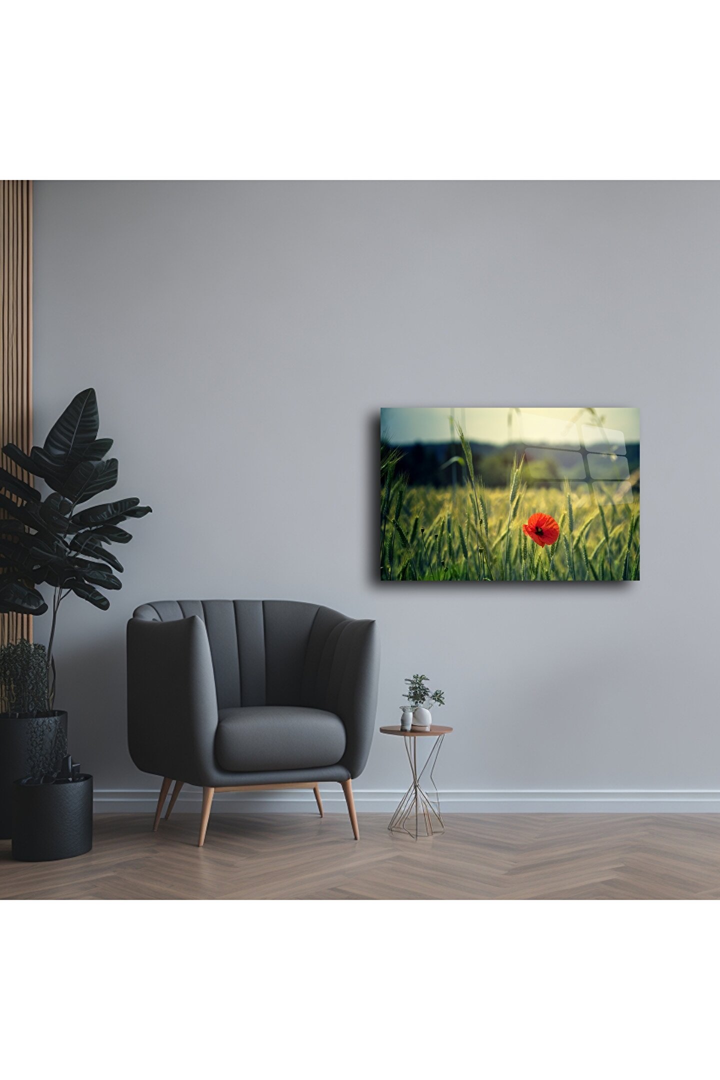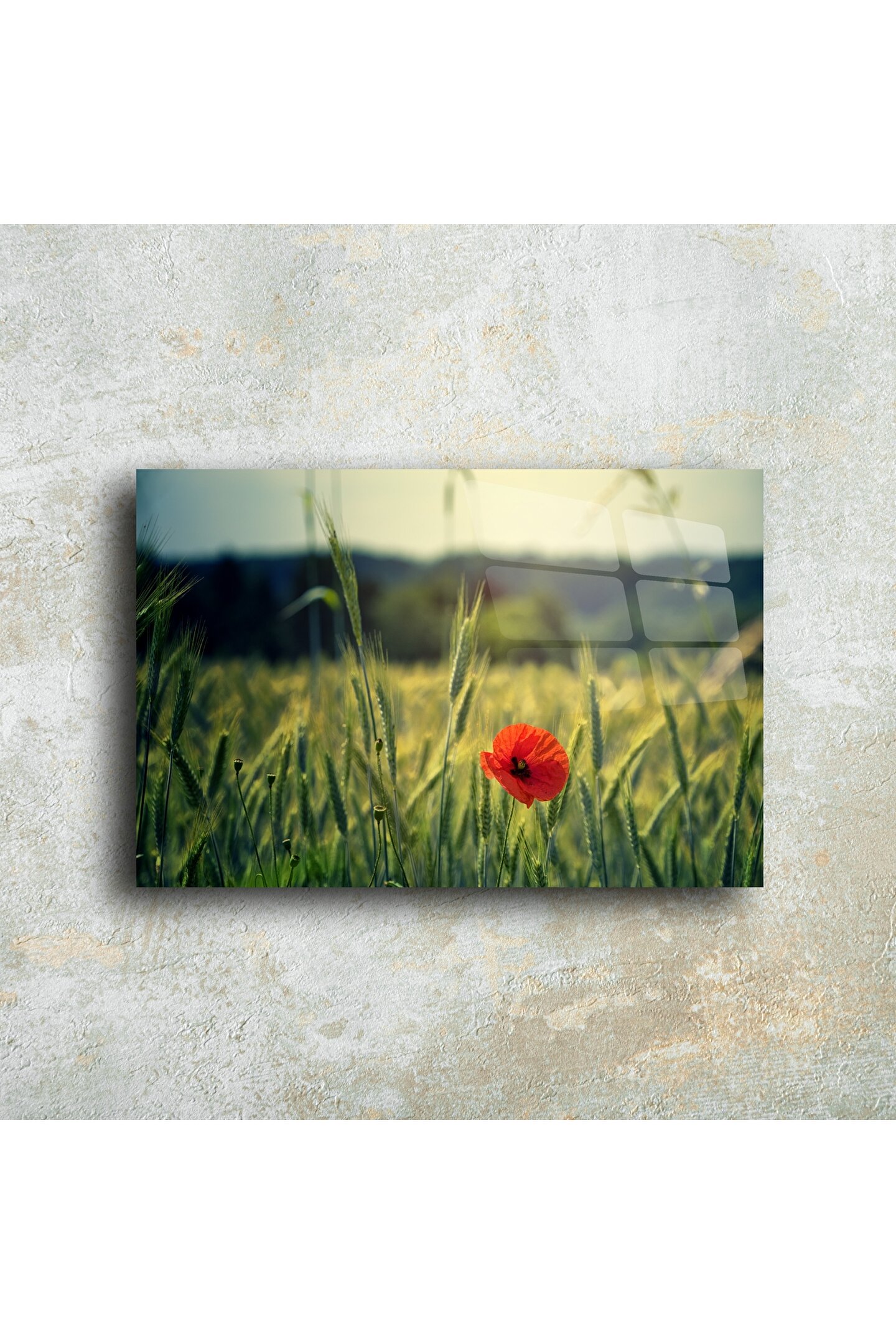 Doğanın içinden gelen dinginliği duvarlarınıza taşıyın: Bu lüks cam tablo, altın saat ışığında bir buğday tarlasında yalnız başına açmış kırmızı bir gelinciği yansıtır. Minimalist manzarası ve cam yüzeyinin derinliğiyle yaşam alanınıza zarafet, huzur ve doğallık katar.