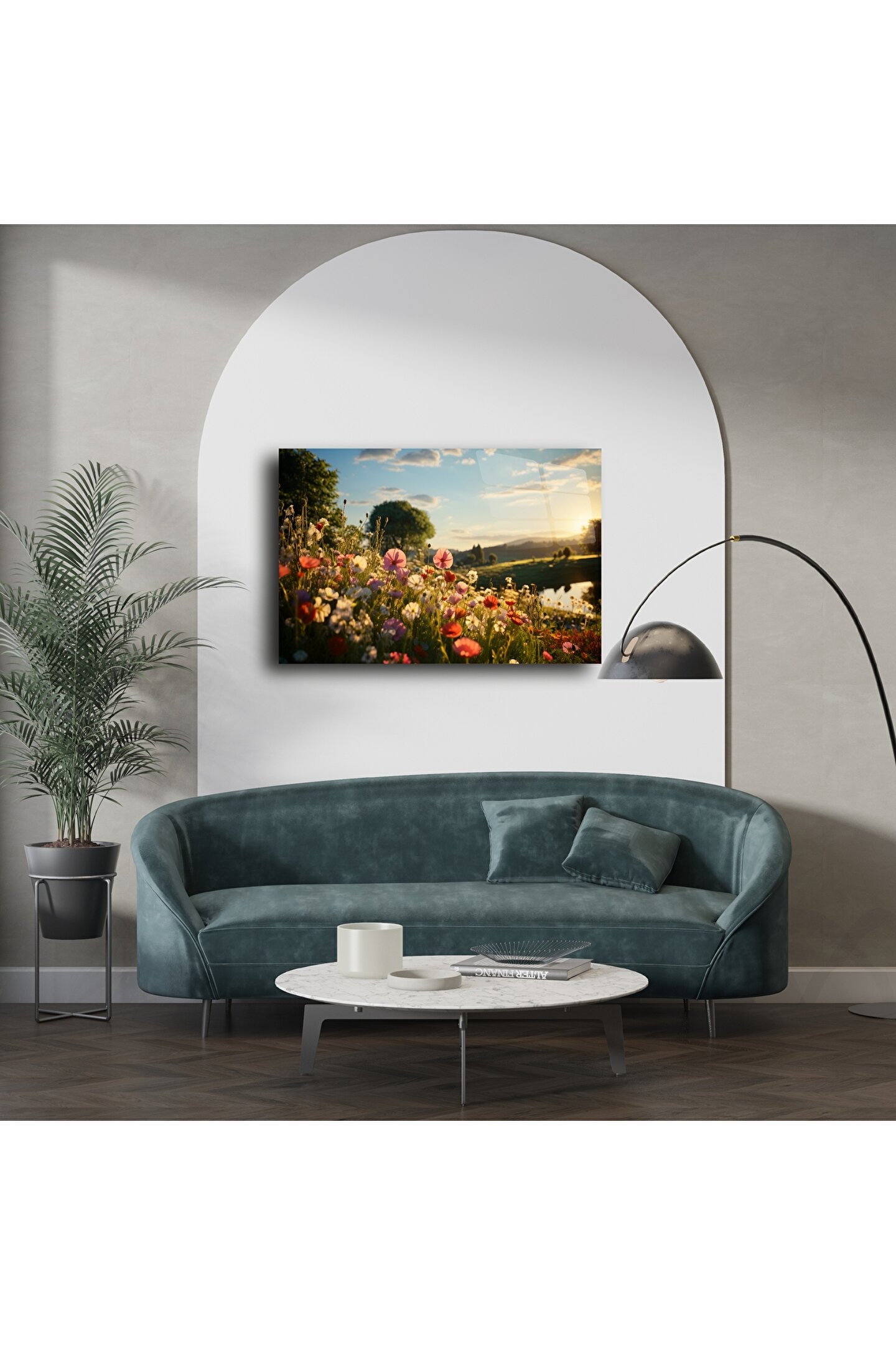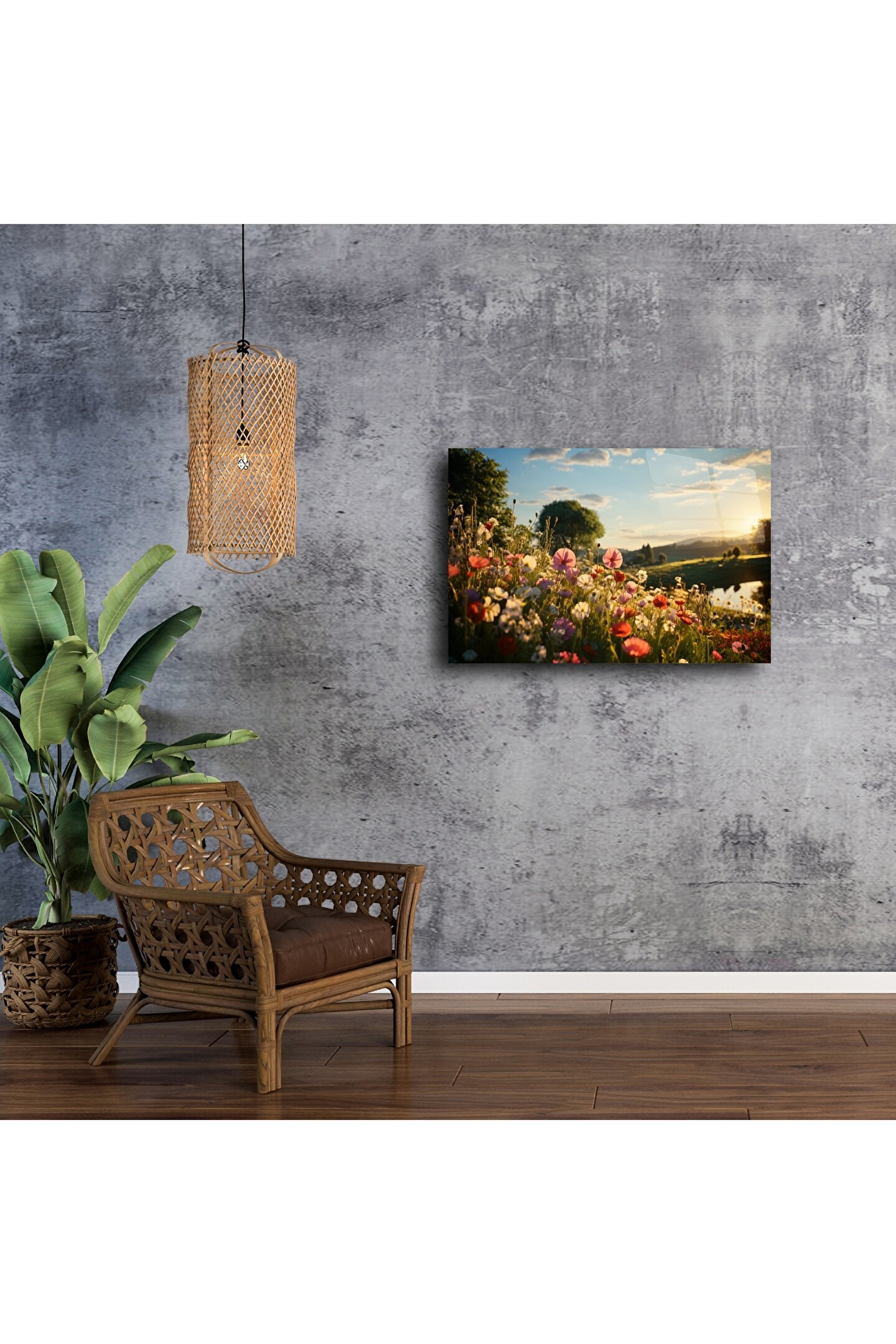 Baharın romantik dokunuşunu her gün duvarınızda yaşayın. Bu doğal çiçek manzarası, yumuşak gün batımı ışığı altında huzur ve umut getiriyor. Vahşi çiçeklerin göz alıcı dokusu, pastoral bir kır yürüyüşünü anımsatıyor — evinizdeki her köşeye sıcaklık ve şiirsellik katmak için tasarlandı.