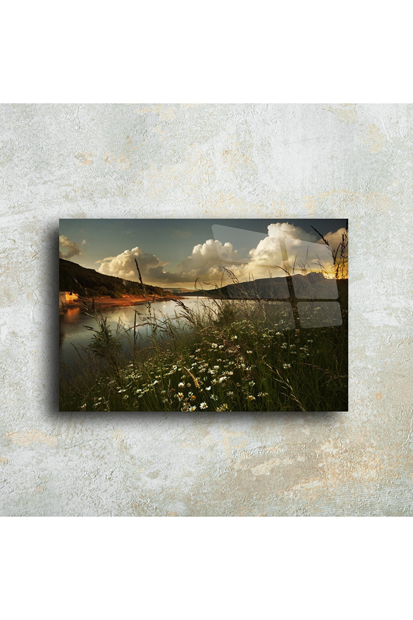 Gün batımında bir göl kenarına eşlik eden papatyaların huzur veren doğallığı bu cam tabloda hayat buluyor. Yüksek kaliteli fotoğraf baskısı ve parlak cam yüzey ile mekanınıza derinlik ve dinginlik katacak zamansız bir duvar sanatı.