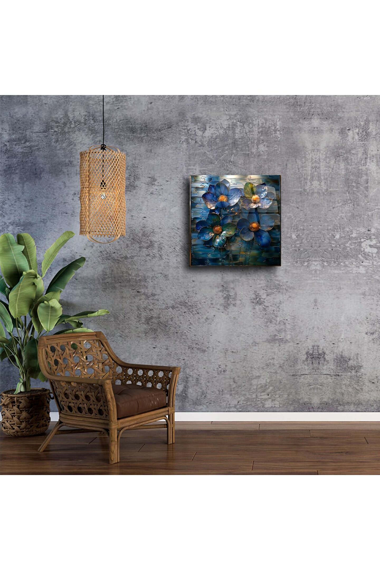 Bu el yapımı cam mozaik çiçek tablo, zarif mavi tonları ve 3 boyutlu tasarımıyla duvarlarınıza modern ve sofistike bir hava katıyor. Her bir çiçek, özenle işlenmiş cam parçalarıyla oluşturulmuş olup, gün ışığında ışıltı kazanarak bulunduğu alana canlılık ve derinlik katar.