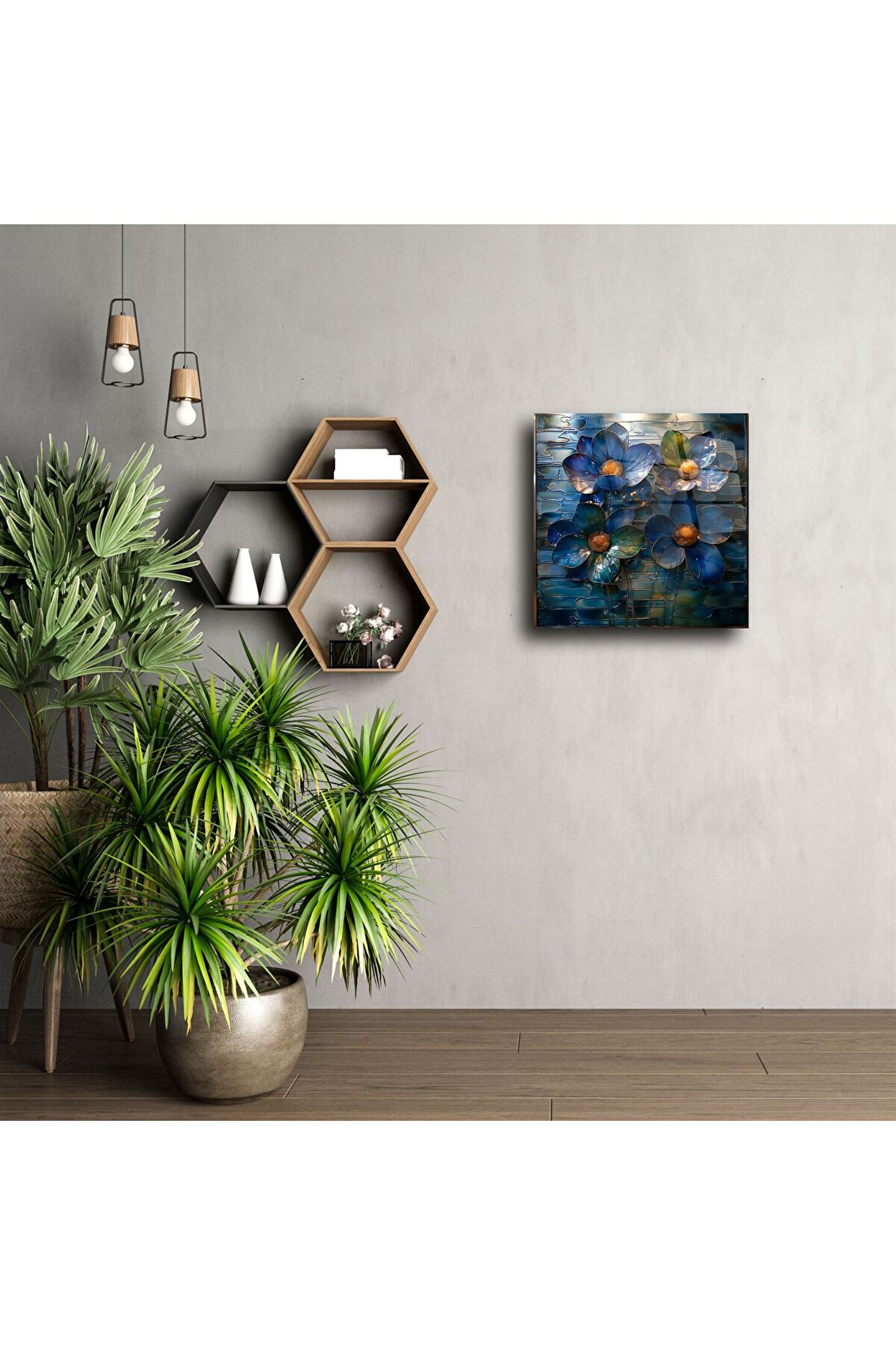Bu el yapımı cam mozaik çiçek tablo, zarif mavi tonları ve 3 boyutlu tasarımıyla duvarlarınıza modern ve sofistike bir hava katıyor. Her bir çiçek, özenle işlenmiş cam parçalarıyla oluşturulmuş olup, gün ışığında ışıltı kazanarak bulunduğu alana canlılık ve derinlik katar.