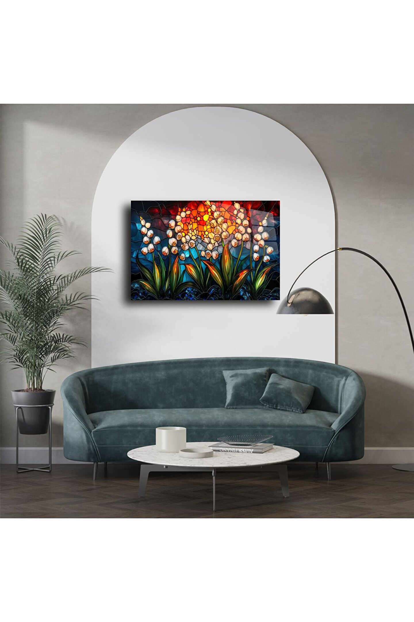 Doğanın büyüleyici zarafetini camın içinde yakalayın. Bu el yapımı mozaik cam tablo, zarif beyaz laleleri, sıcak turuncu güneşi ve derin mavi gökyüzünü canlı bir sanata dönüştürüyor. Işıkla dans eden renkler yaşam alanınıza büyülü bir huzur katar. Modern, klasik ya da bohem tüm dekorasyon stillerine uyum sağlar.