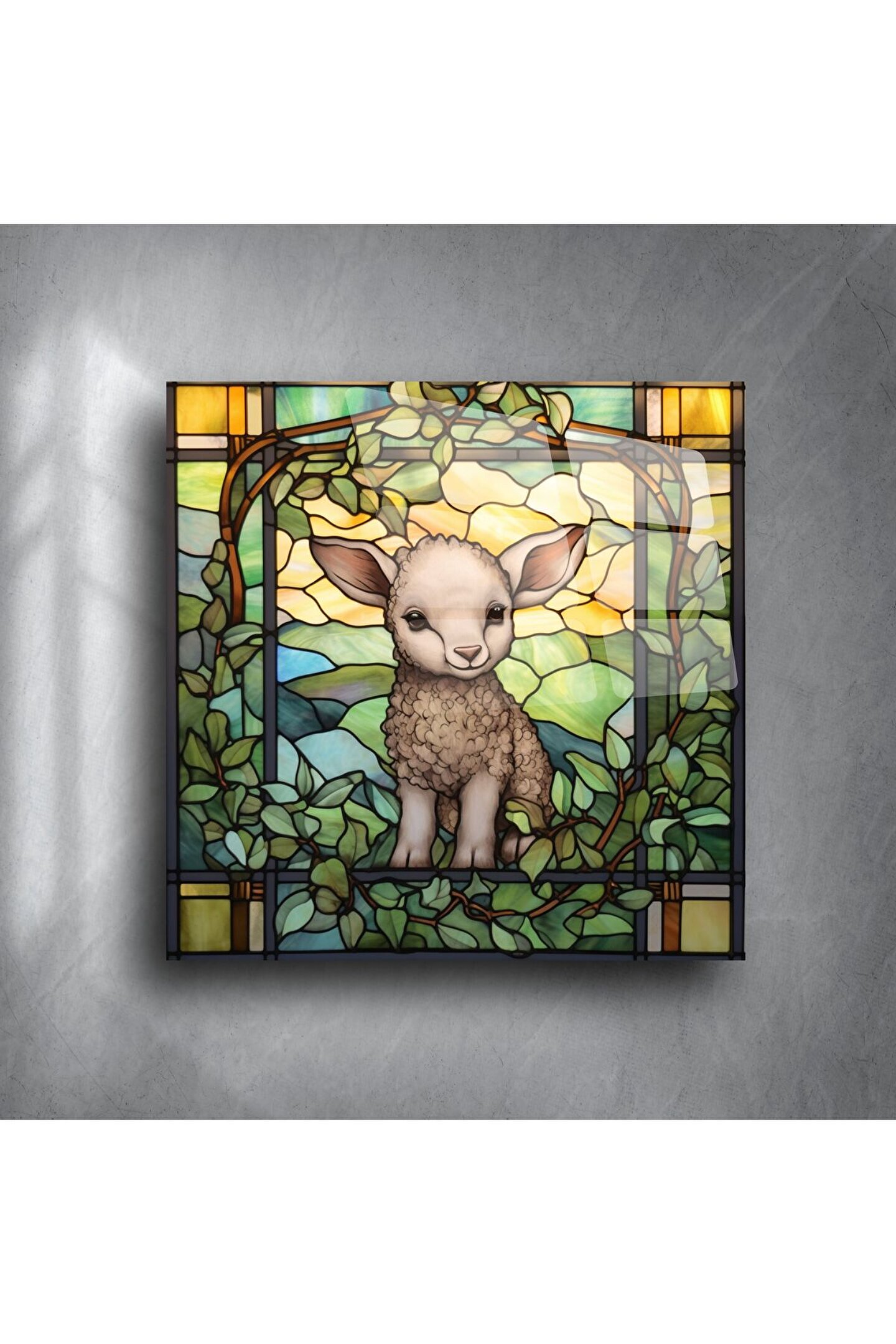 Renkli cam hissi veren, el yapımı görünümlü bu büyüleyici kuzu tablosu; pastoral doğanın sıcaklığını evinize taşıyor. Anahtar kelime: kuzu duvar sanatı— sevimliliği, huzuru ve doğayı yansıtan bu eser, çocuk odaları veya rahatlatıcı köşeler için ideal.
