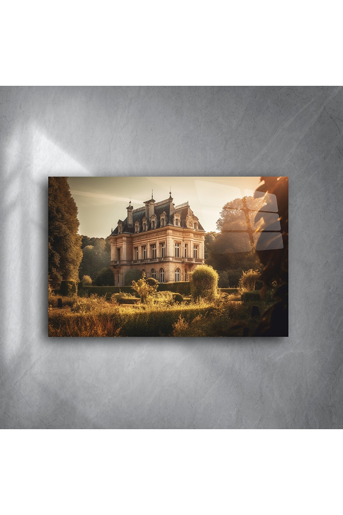 Bu etkileyici cam tablo, altın saat ışığında parlayan zarif bir Fransız malikanesini ve çevresindeki heykel gibi düzenlenmiş bahçeleri büyüleyici bir şekilde yansıtır. Klasik mimariye duyulan hayranlığı modern sanatla buluşturarak zamansız bir dekor parçası sunar.