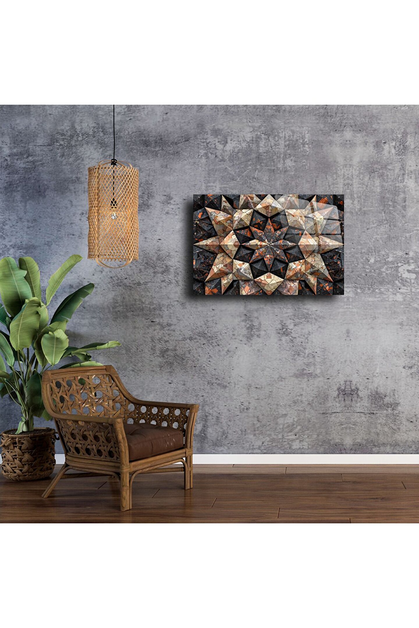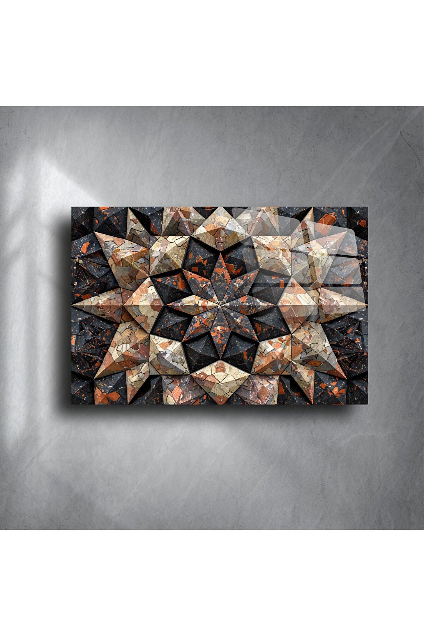 Göz alıcı derinlik efektiyle tasarlanmış bu geometrik cam tablo, siyah ve toprak tonlarının eşsiz uyumunu modern bir estetikle buluşturuyor. Kaliteli temperli cam üzerine yüksek çözünürlüklü baskı uygulanarak üretilmiştir. Bu lüks duvar sanatı, evinizin ya da ofisinizin havasını değiştirerek sofistike bir görünüm sunar.