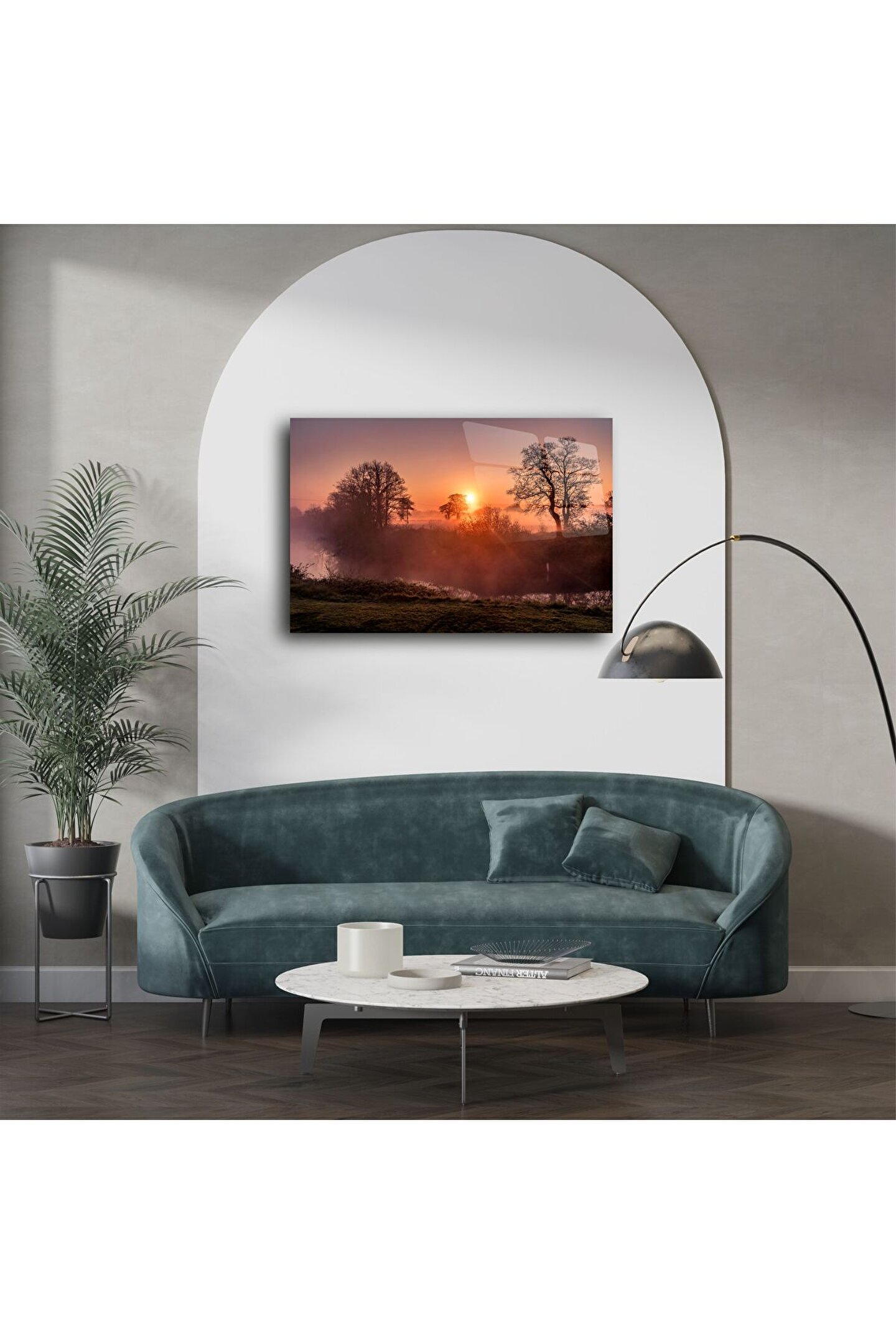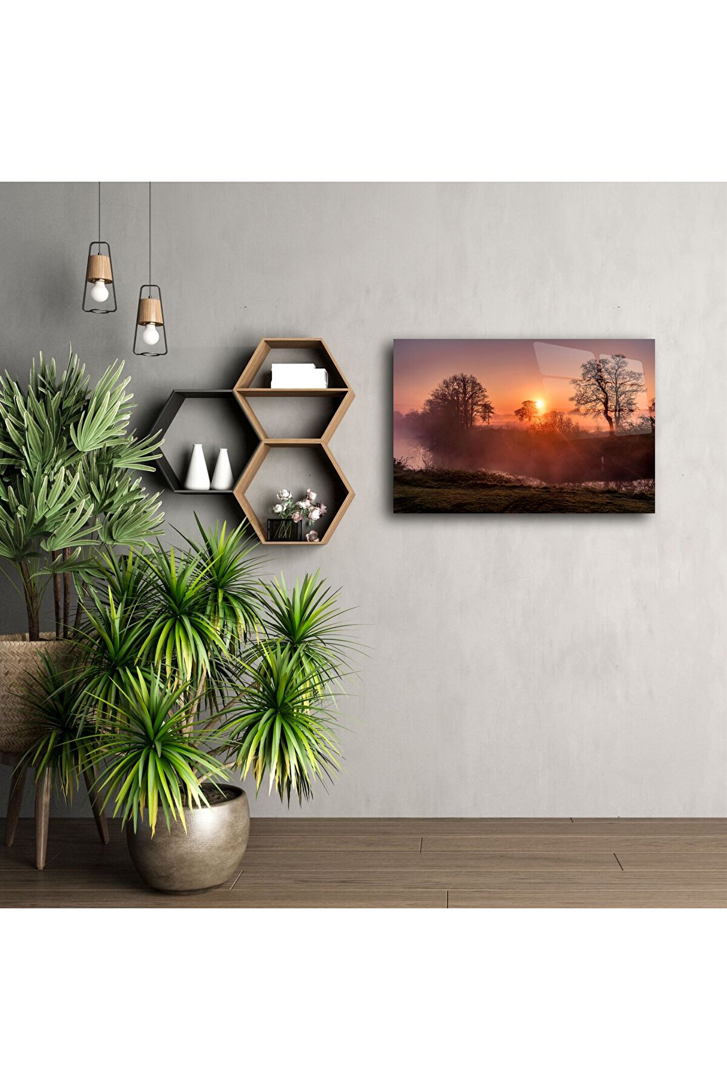 Yeni bir başlangıcın sembolü olan gün doğumu, bu zarif cam tabloda huzurun ve dinginliğin estetikle birleştiği bir manzara olarak karşınıza çıkıyor. Sisli sabah havası, turuncu ve mor tonlarda gökyüzü, ağaç silüetleriyle birleşerek duvarlarınıza şiirsel bir atmosfer katıyor.