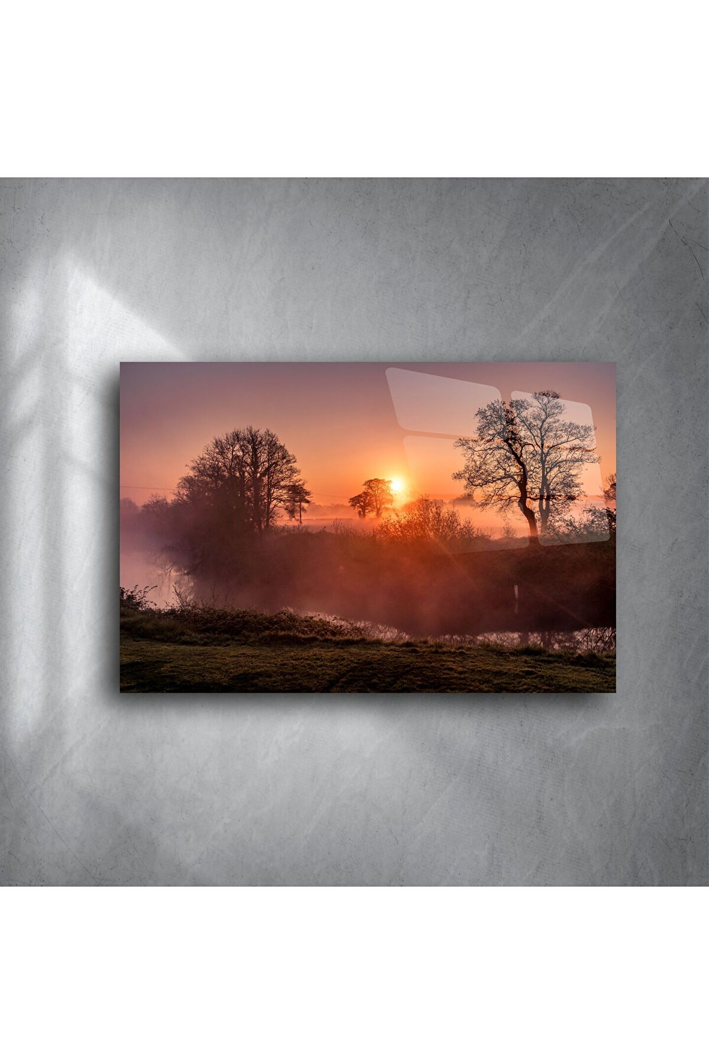 Yeni bir başlangıcın sembolü olan gün doğumu, bu zarif cam tabloda huzurun ve dinginliğin estetikle birleştiği bir manzara olarak karşınıza çıkıyor. Sisli sabah havası, turuncu ve mor tonlarda gökyüzü, ağaç silüetleriyle birleşerek duvarlarınıza şiirsel bir atmosfer katıyor.