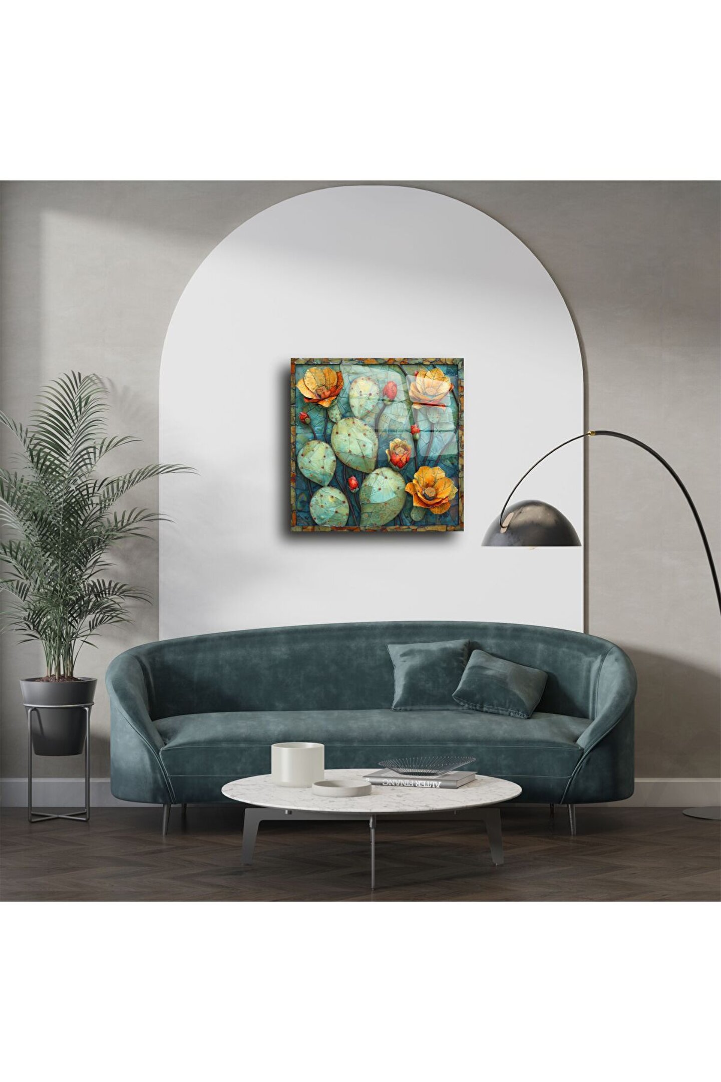 Doğanın doğal formlarından ilham alan bu kaktüs desenli cam tablo, yaşam alanlarınıza modern ve bohem bir ruh katıyor. Özenle yerleştirilmiş yeşil tonlarındaki yapraklar ve sıcak tonlarda açan çiçekler, dikkat çekici bir vitray etkisi yaratıyor.