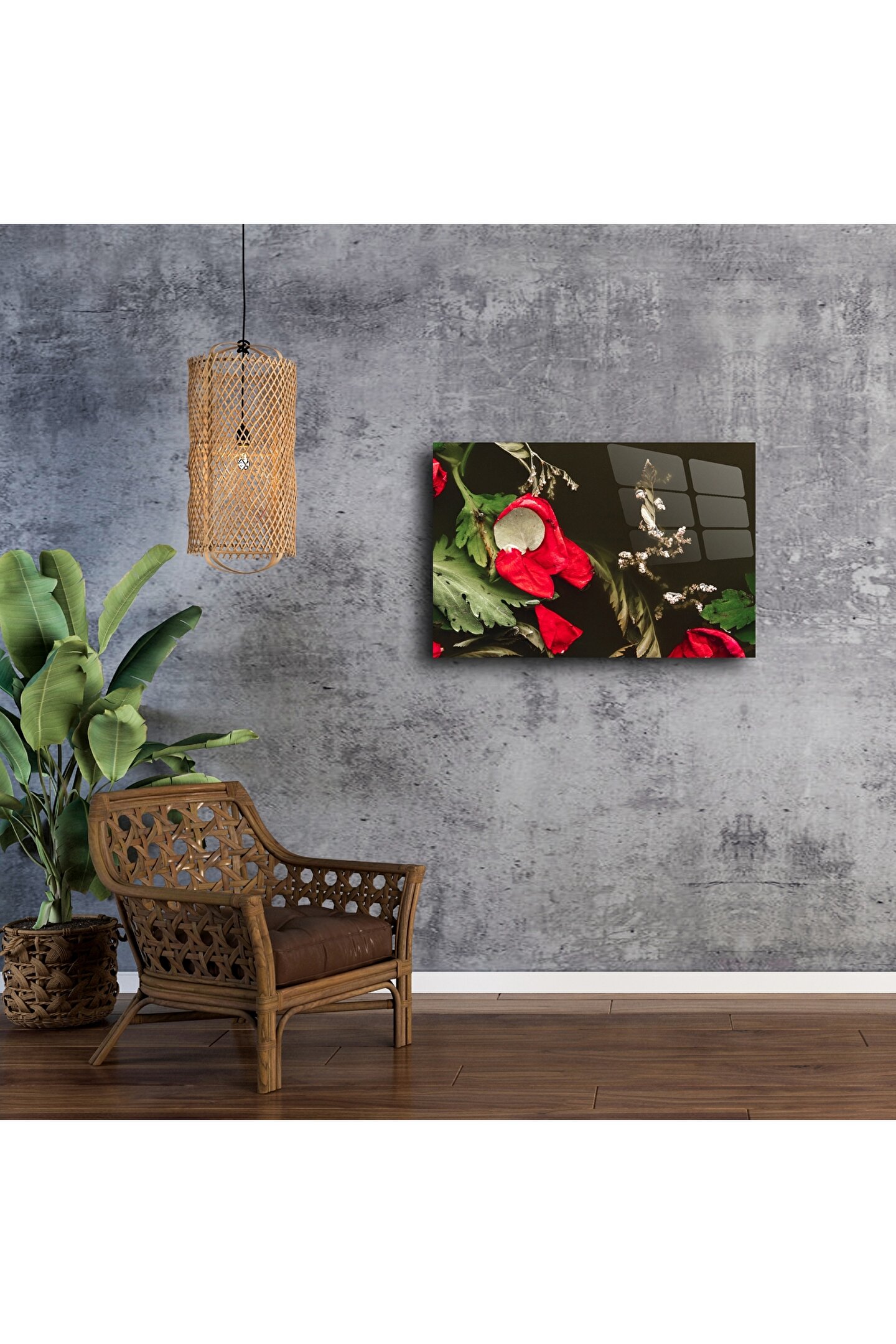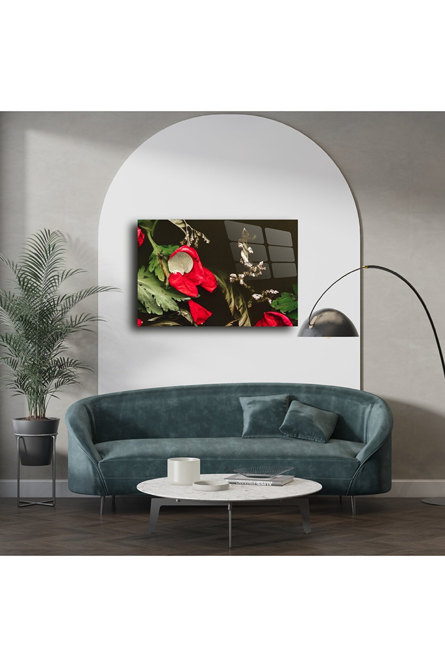 Doğanın zarafetini evinize taşıyan bu cam tablo, kırmızı gelincik çiçekleri ve yeşil yaprakların sanatsal birleşimiyle sakinlik ve şıklığı bir araya getiriyor. Parlak cam yüzey üzerine yapılan detaylı baskı, çiçekleri adeta canlıymış gibi yansıtarak duvarınıza hayat katar.