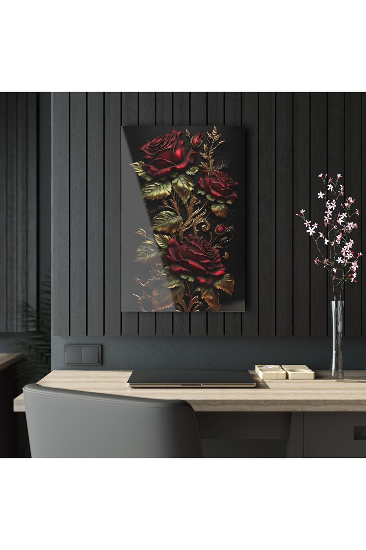 LEYLASER Kırmızı Gold Renkli Gül Cam Tablo Duvar Dekoru