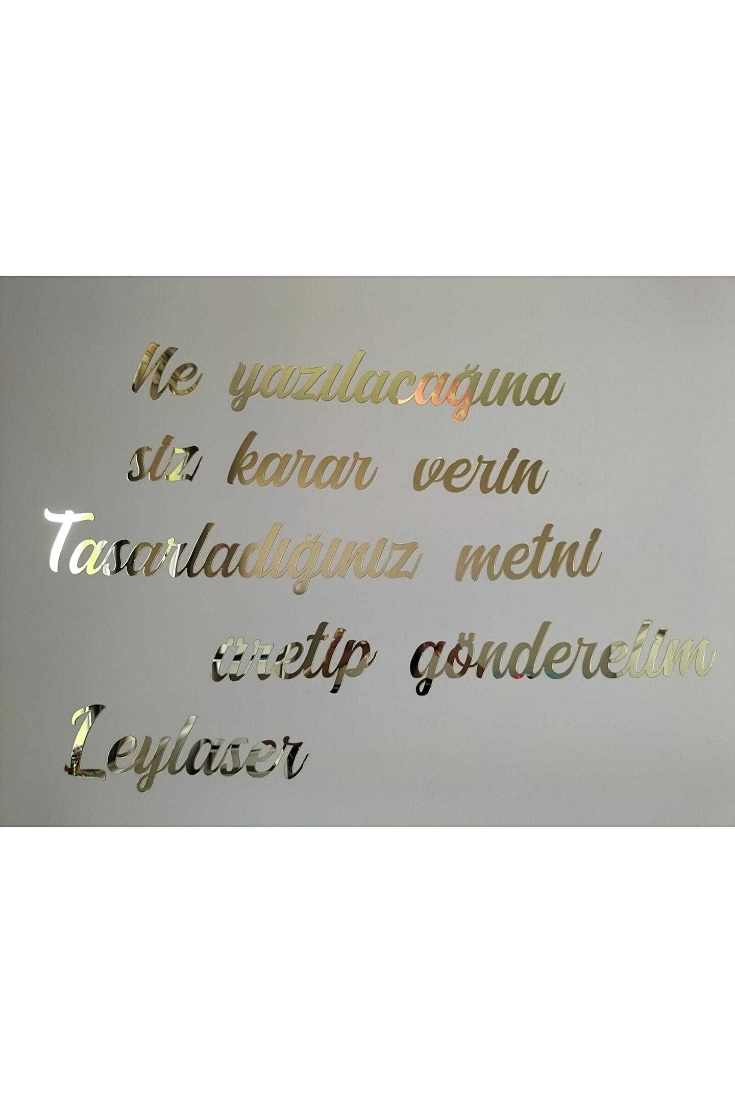 Ürünümüz 50 harf için geçerlidir.; Her 50 harfte 1 ürün almalısınız.; Küçük harfleri 1, Büyük harfleri de 3 saymalısınız.; Harf ölçüleri standarttır.; ölçüler ikinci resimde verilmiştir.; Ürünü satın aldıktan sonra ürün sorularından önce sipariş numaranızı ardından da yazdırmak istediğiniz yazıyı yazdırabilirsiniz.; Hiçbirşey belirtmezseniz resimdeki yazı stili ile gönderilir.; ama yazı tipini değiştirmek istiyorsanız lütfen bize ulaşın.; istediğiniz yazı tipi ismini belirtirseniz yardımcı oluruz.; FARKLI ÖLÇÜ VE EBATLAR İÇİN LÜTFEN BİZE ULAŞINIZ.; MARKA İSMİMİZİ İNTERNETTE ARATINCA İLETİŞİM BİLGİLERİMİZE ULAŞABİLİRSİNİZ.; İster kendi kelimeleriniz ister beğendiğiniz bir söz yada size ait bir şiiir olsun duvarınızda ya da bütün düz zeminlerde kullanabileceğiniz duvar yazınızı bize bildirin biz üretelim Hiçkimsede olmayan duvar dekorunuz olsun Size özel duvar yazınız ayağınıza gelsin :) 1 mm GOLD renk kendinden yapışkanlı aynalı pleksi malzeme ile Leylaser tarafından üretilmiştir.; Direk bantın korumasını çıkartıp duvara monte edebilirsiniz.; ; Her kelime ayrı bir parça olarak gelecektir.; ; İstediğiniz şekilde kombin edebilirsiniz.; ; Yazdırmak istediğiniz metni satıcı sorularından ya da ürün sorularından sipariş numaranızla birlikte bildirebilirsiniz.; ; Yazdırmak istediğiniz metinde yer alan harf sayısına göre fiyatlandırma yapılmaktadır.