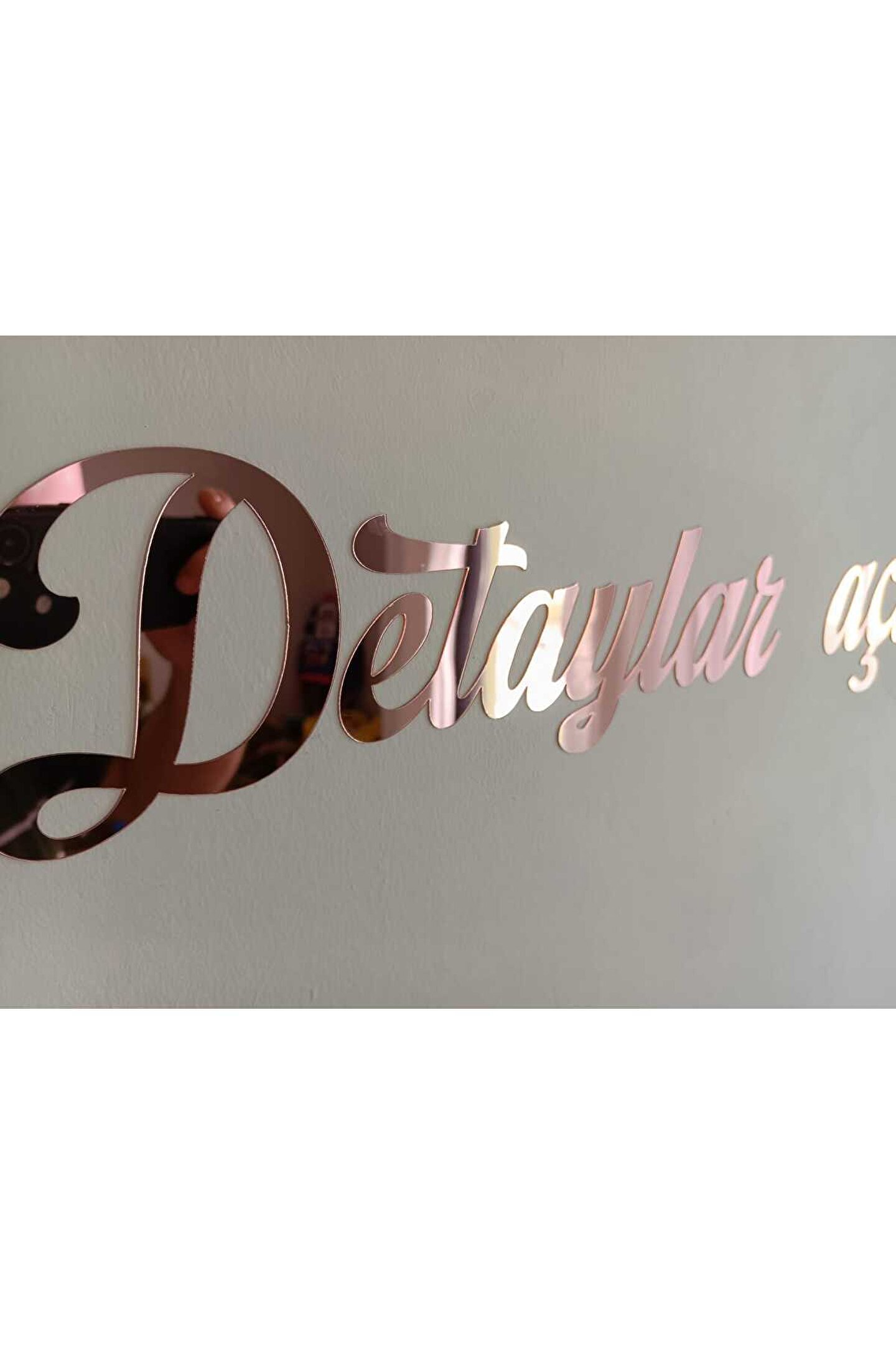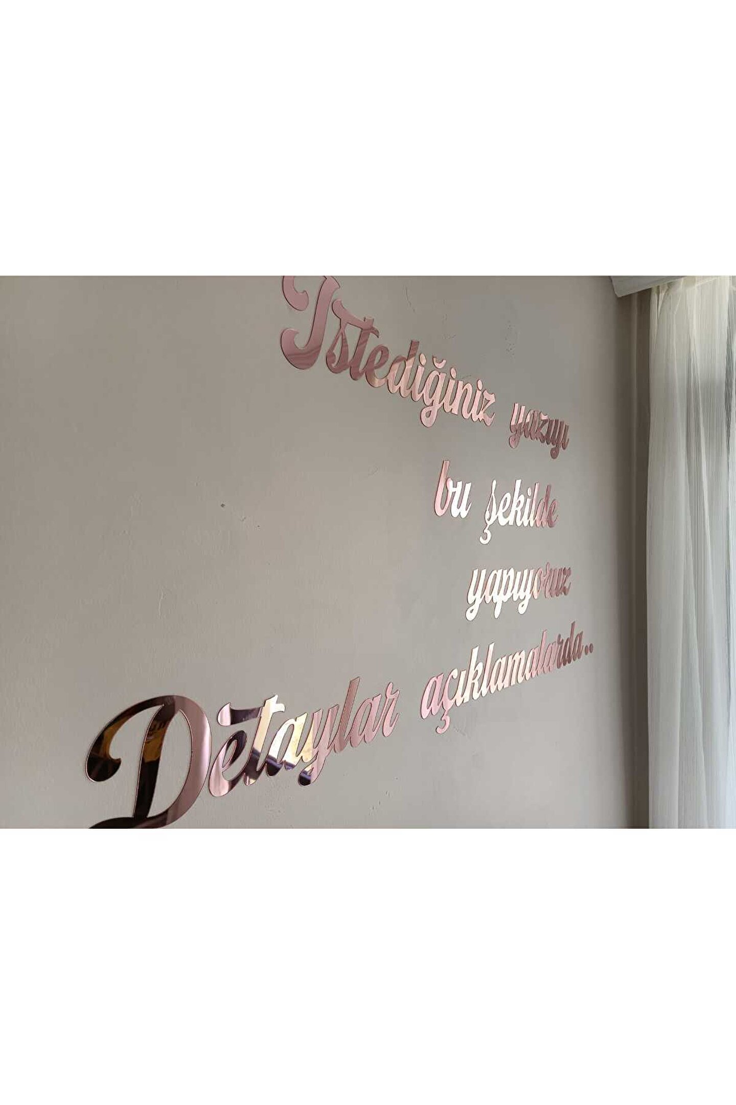 Ürünümüz 50 harf için geçerlidir.; Her 50 harfte 1 ürün almalısınız.; Küçük harfleri 1, Büyük harfleri de 3 saymalısınız.; Harf ölçüleri standarttır.; ölçüler ikinci resimde verilmiştir.; Ürünü satın aldıktan sonra ürün sorularından önce sipariş numaranızı ardından da yazdırmak istediğiniz yazıyı yazdırabilirsiniz.; Hiçbirşey belirtmezseniz resimdeki yazı stili ile gönderilir.; ama yazı tipini değiştirmek istiyorsanız lütfen bize ulaşın.; istediğiniz yazı tipi ismini belirtirseniz yardımcı oluruz.; FARKLI ÖLÇÜ VE EBATLAR İÇİN LÜTFEN BİZE ULAŞINIZ.; MARKA İSMİMİZİ İNTERNETTE ARATINCA İLETİŞİM BİLGİLERİMİZE ULAŞABİLİRSİNİZ.; İster kendi kelimeleriniz ister beğendiğiniz bir söz yada size ait bir şiiir olsun duvarınızda ya da bütün düz zeminlerde kullanabileceğiniz duvar yazınızı bize bildirin biz üretelim Hiçkimsede olmayan duvar dekorunuz olsun Size özel duvar yazınız ayağınıza gelsin :) 1 mm ROSE GOLD renk kendinden yapışkanlı aynalı pleksi malzeme ile Leylaser tarafından üretilmiştir.; Direk bantın korumasını çıkartıp duvara monte edebilirsiniz.; ; Her kelime ayrı bir parça olarak gelecektir.; ; İstediğiniz şekilde kombin edebilirsiniz.; ; Yazdırmak istediğiniz metni satıcı sorularından ya da ürün sorularından sipariş numaranızla birlikte bildirebilirsiniz.; ; Yazdırmak istediğiniz metinde yer alan harf sayısına göre fiyatlandırma yapılmaktadır.