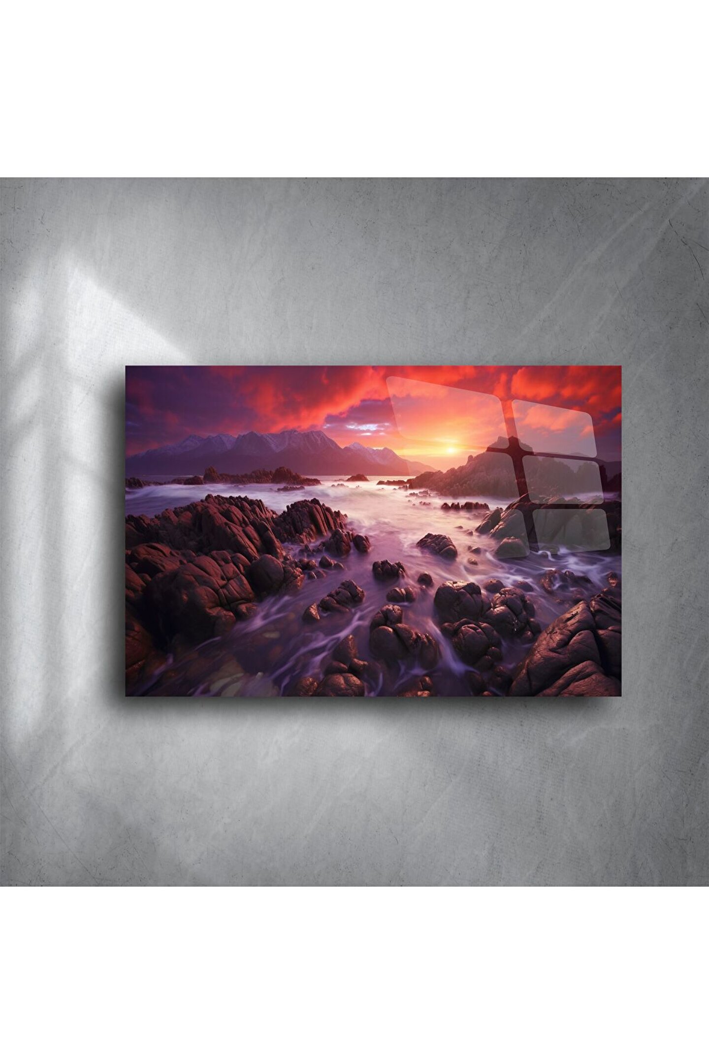 Günün en büyülü anını yansıtan bu kızıl gün batımı manzaralı cam tablo, evinizin duvarlarına güçlü bir doğa hikayesi katıyor. Sularla şekillenmiş kayalıklar ve arka planda uzanan dağ silueti, izleyenlere huzur ve hayranlık duygularını aynı anda yaşatıyor.