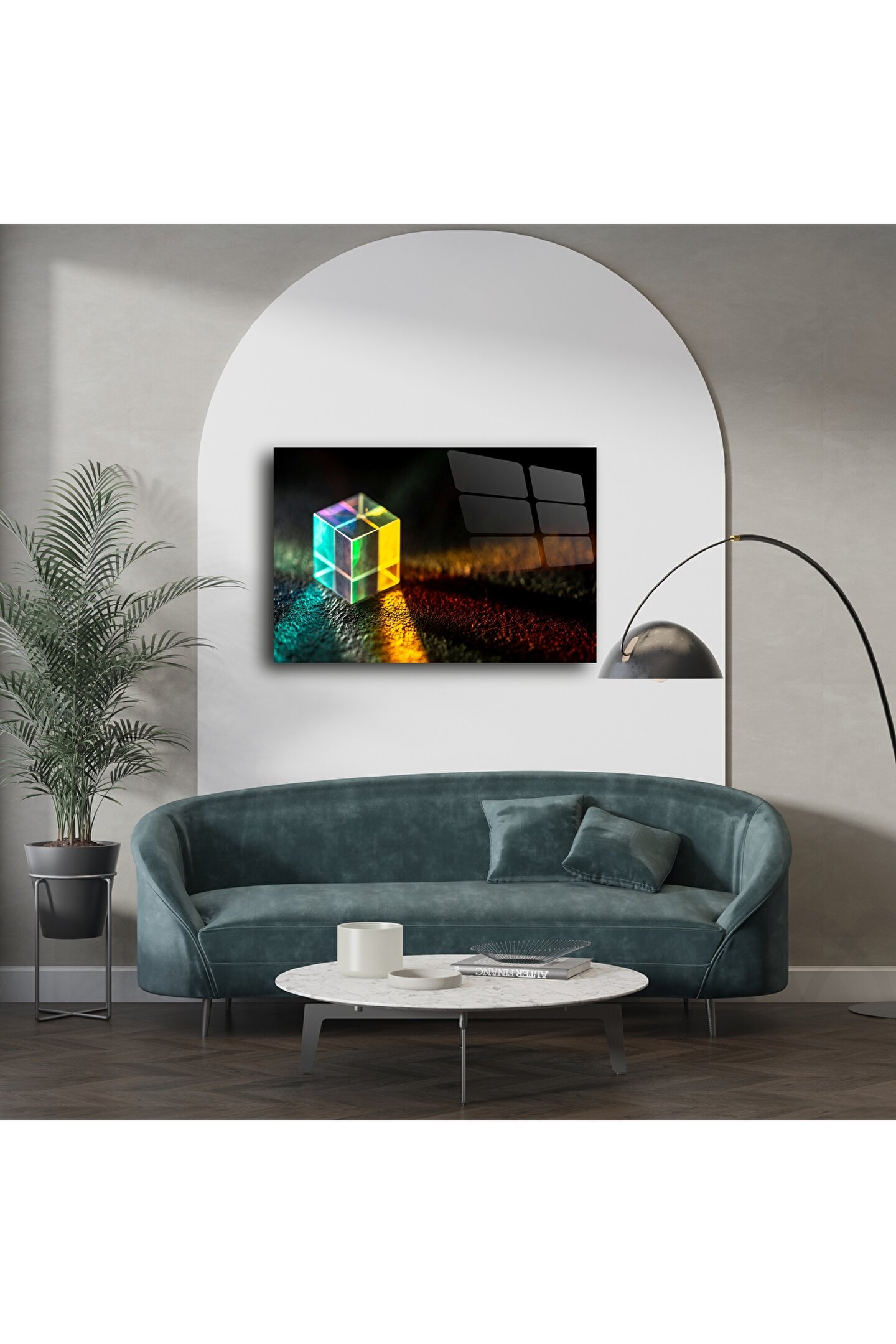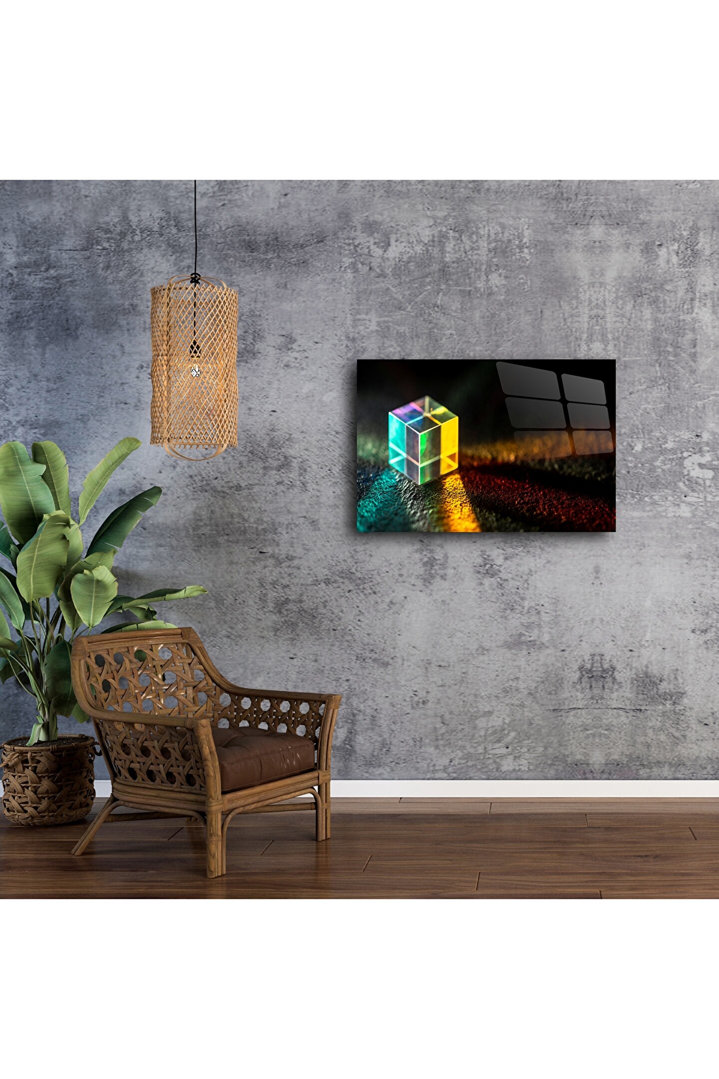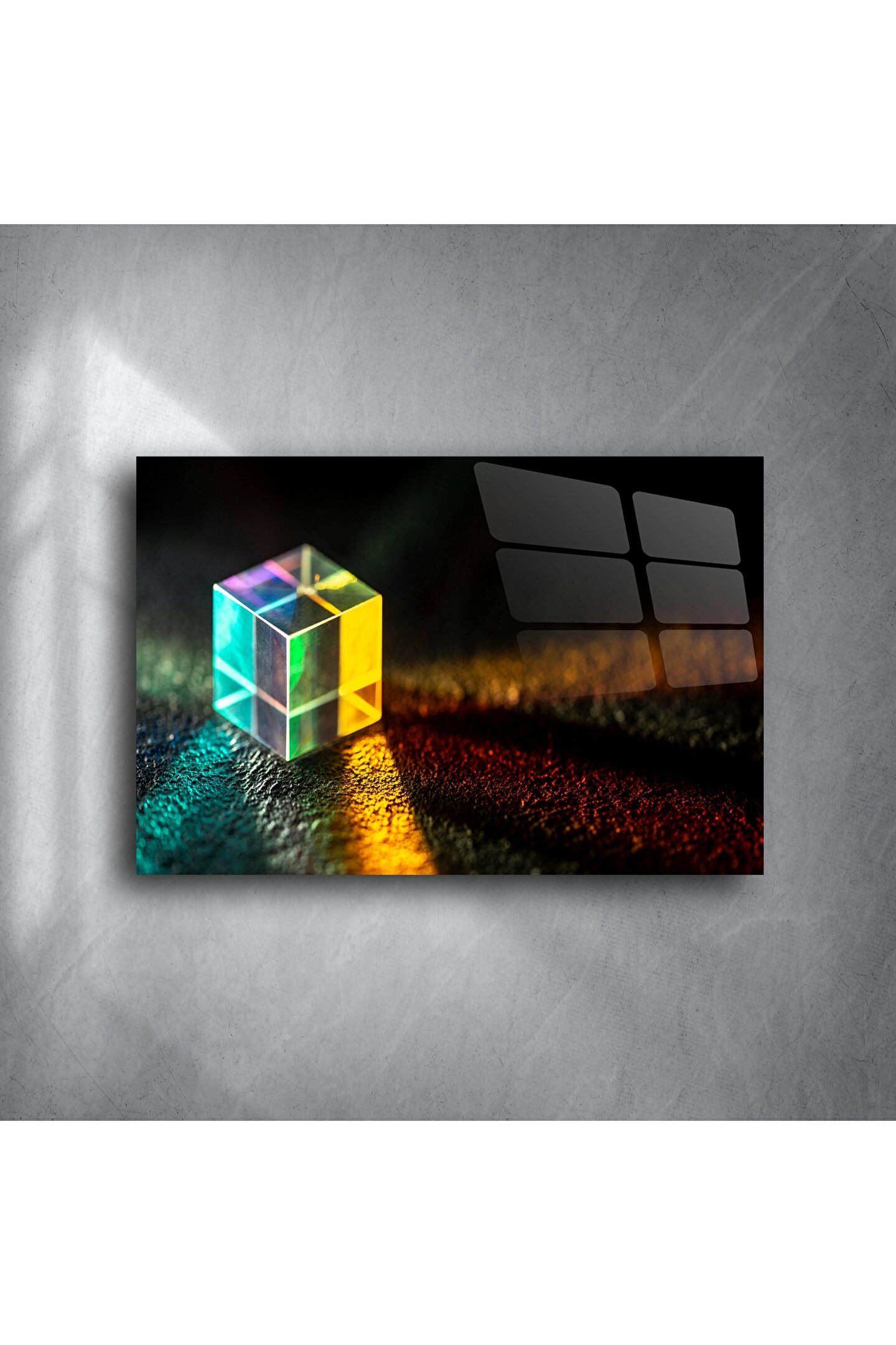 Modern zarafeti mekânınıza taşıyan bu cam prizma küp duvar sanatı, ışığın, geometrinin ve sanatsal netliğin parıldayan bir kutlamasıdır. Kristalden yayılan canlı spektrum, dokulu yüzeyde yankılanarak hayranlık ve huzur hissi yaratır – meditasyon köşeleri ve yaratıcı alanlar için idealdir.