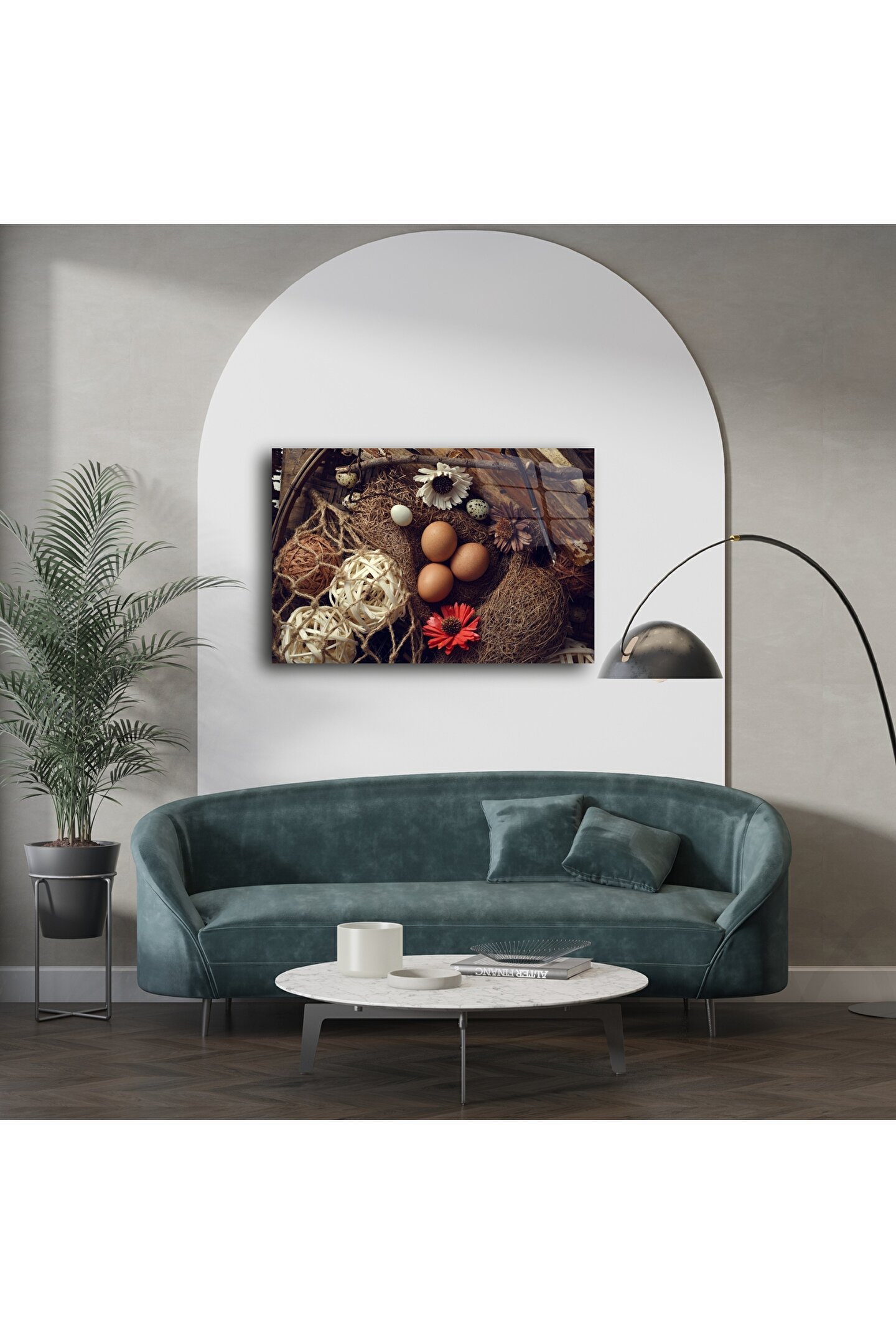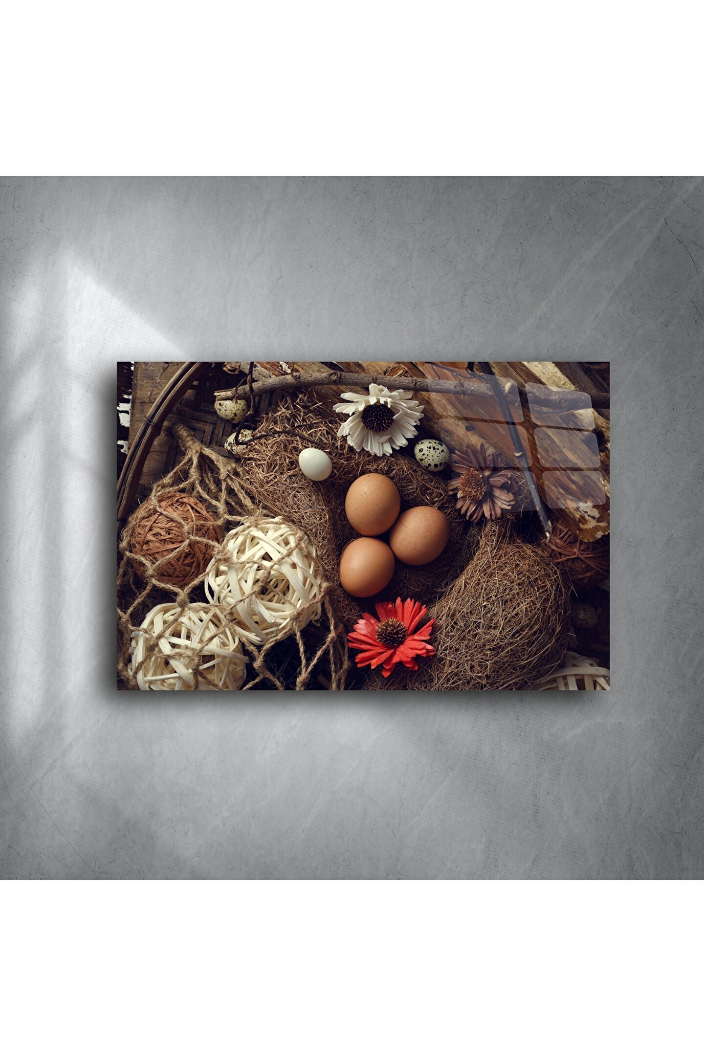 Rustik yaşamın sıcaklığını evinize taşıyın! Bu detaylı çiftlik temalı yumurta yuvası duvar posteri, doğal kahverengi yumurtalar, kurutulmuş çiçekler ve doku dolu hasır detaylarıyla huzur ve doğallık sunuyor. Arka plandaki eskitilmiş ahşap dokusu ise nostaljik bir hava katıyor.