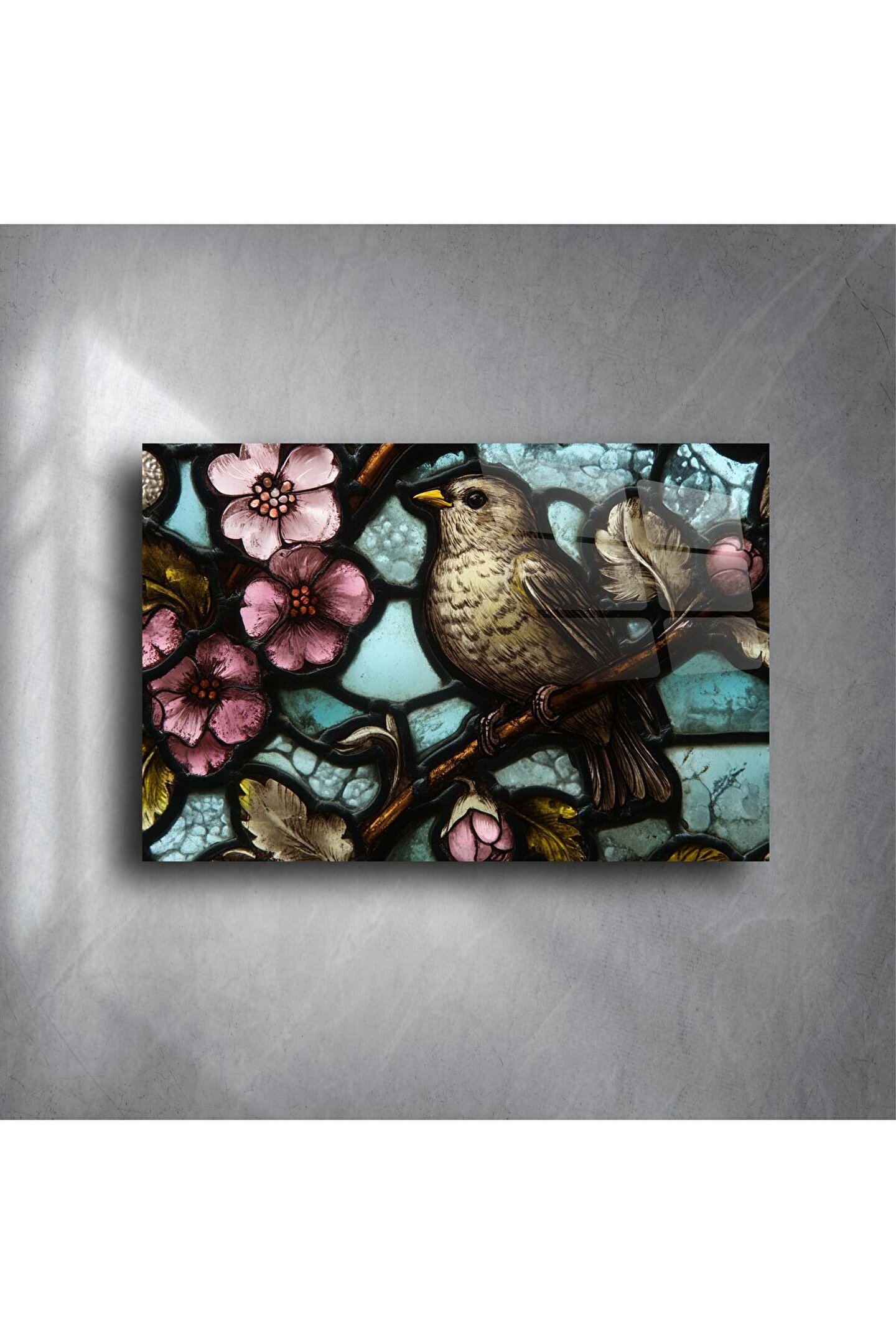 Bu kuş ve çiçek temalı cam tablo, pastel tonlardaki vitray efektiyle ilkbaharın hafifliğini duvarlarınıza taşır. Zarif kuş figürü ve narin çiçek dokuları, doğayı sevenler için huzur dolu bir atmosfer yaratır.