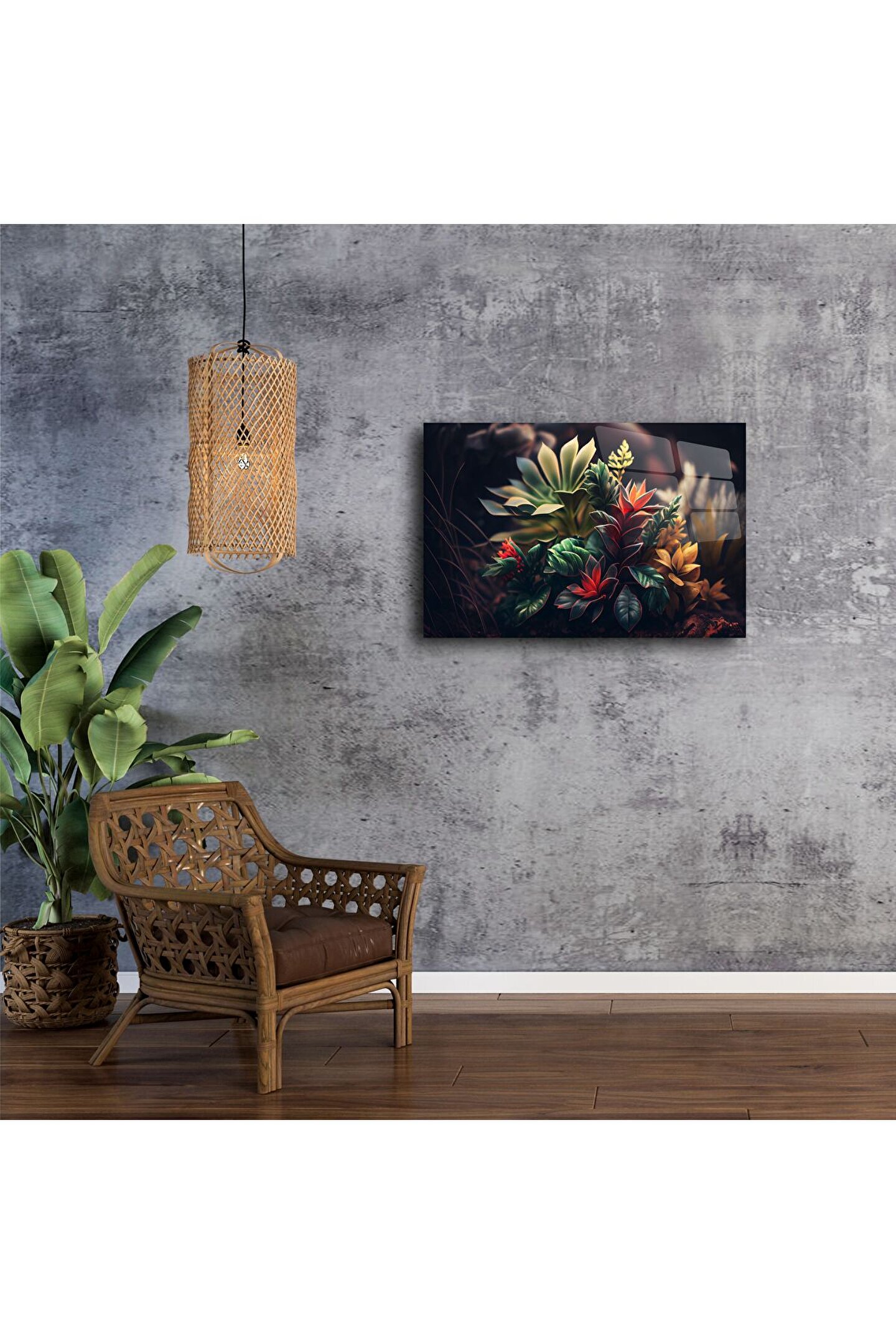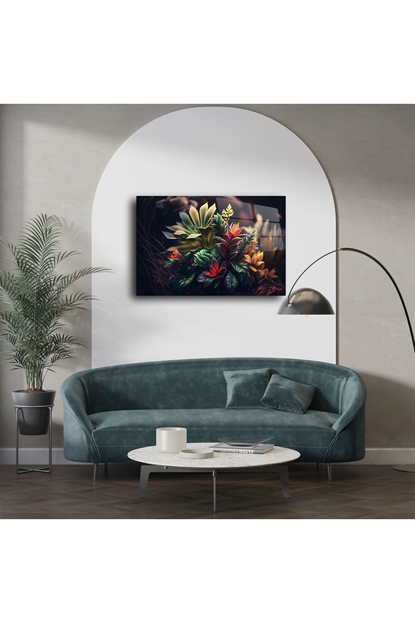 Bu lüks cam tablo, canlı renklerdeki tropikal yaprak kompozisyonuyla doğayı evinize getiriyor. Yüksek çözünürlükte parlak cam yüzey üzerine işlenmiş bu özel bitki sanatı, modern yaşam alanlarında sofistike bir etki yaratır. Renklerin uyumu ve detaylı tasarımıyla hem göz alıcı hem huzur verici bir dekoratif parçadır.