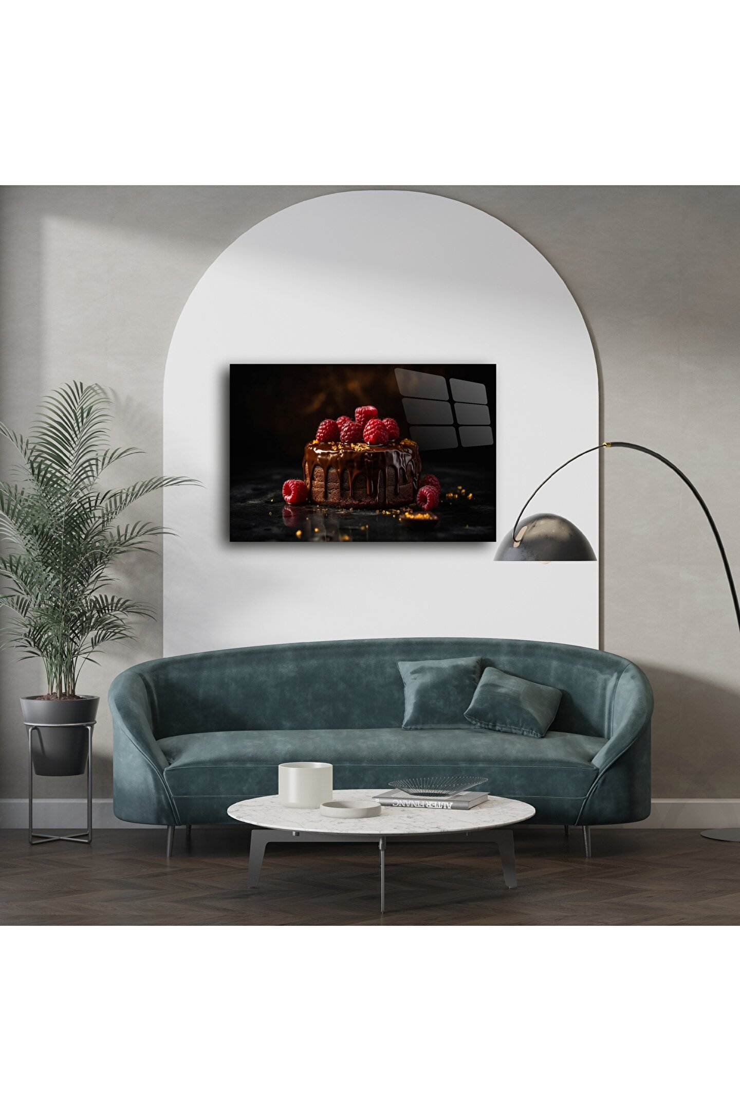 Çikolatalı ahududulu bu lüks cam tablo, mutfağınıza veya oturma odanıza sofistike ve iştah açıcı bir hava katmak için tasarlandı. Gerçek çikolata kaplı pasta ve canlı kırmızı ahududu detaylarıyla, her baktığınızda tatlı bir kaçamağa davet eden bir sanat eseri.