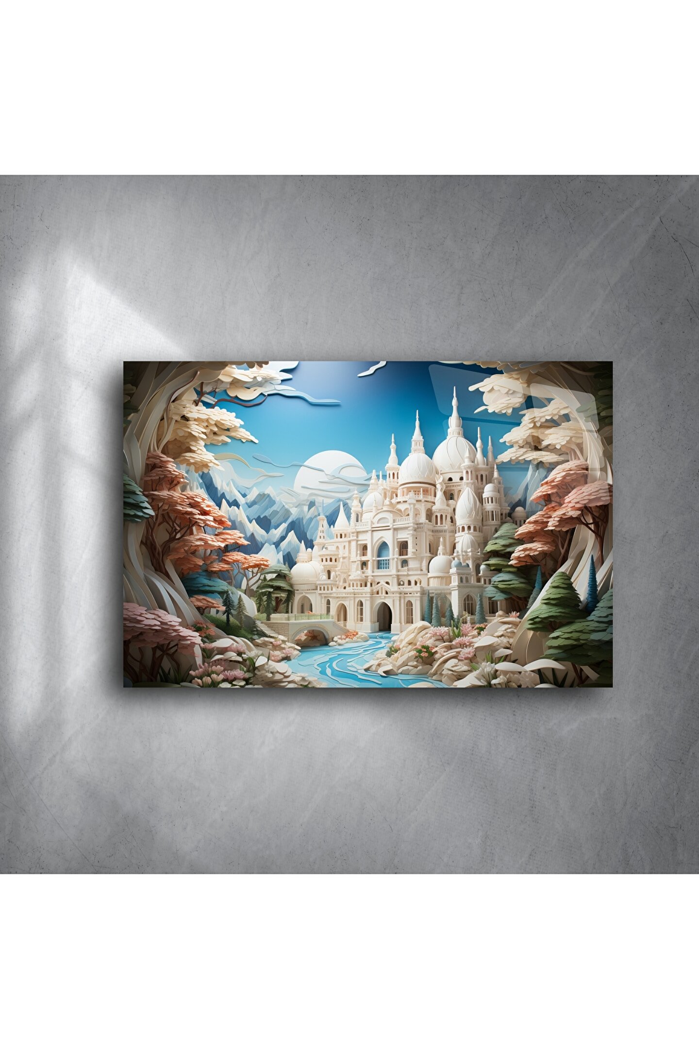 Soyut Şato Manzaralı Duvar Posteri, hayal gücünü harekete geçiren zarif detaylarla tasarlanmış büyüleyici bir dijital sanat eseridir. Büyülü bir vadinin kalbinde yer alan bu fantastik saray, pastel ve canlı tonların zarif birleşimiyle evinize masalsı bir hava katar.