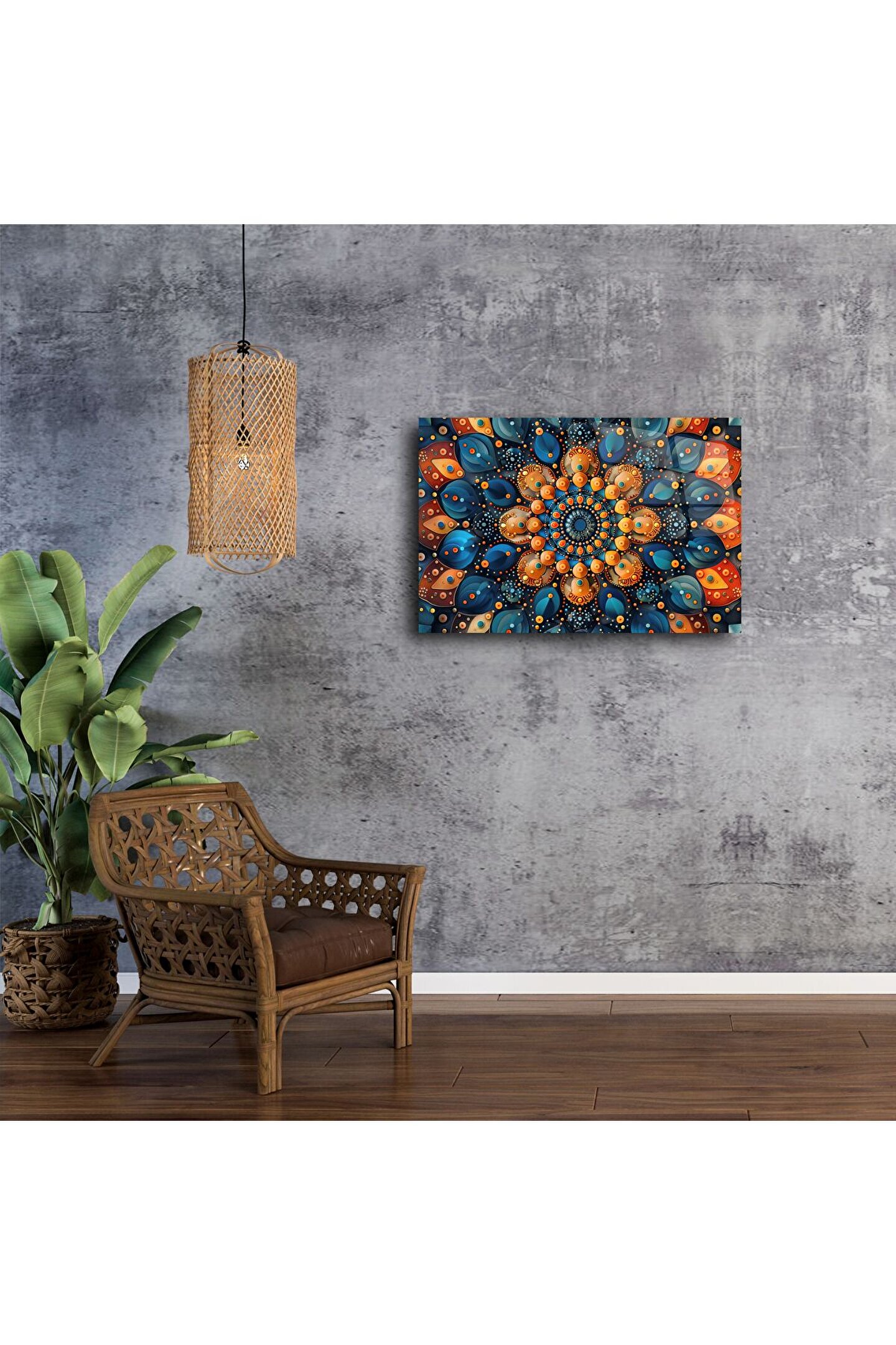 Bu canlı mandala duvar sanatıyla alanınıza denge ve parlaklık katın. Yanan turuncular, safir maviler ve ışıltılı altın tonlarıyla tasarlanmış bu eser, dikkat çekici bir simetriyle ruhunuzu ve ortamınızı canlandırır. Meditasyon köşeleri, yoga stüdyoları veya cesur modern iç mekanlar için mükemmel bir seçimdir.