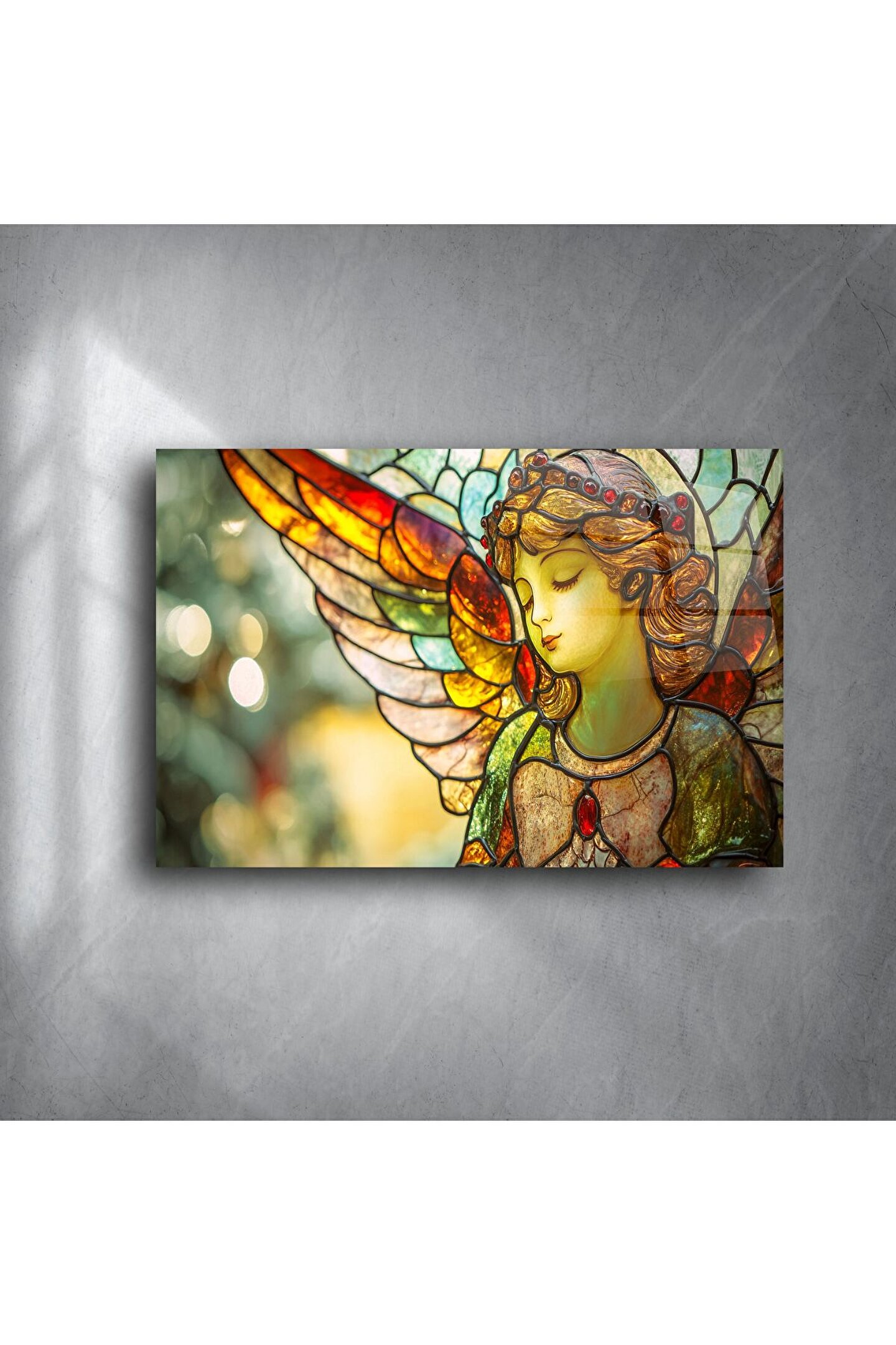 Bu narin melek figürüyle tasarlanmış vitray stil cam tablo, huzur ve zarafet arayan yaşam alanları için eşsiz bir sanatsal dokunuş sunuyor. Pastel tonlar ve cam üzerindeki ışık oyunları, her bakışta içsel bir dinginlik uyandırıyor.