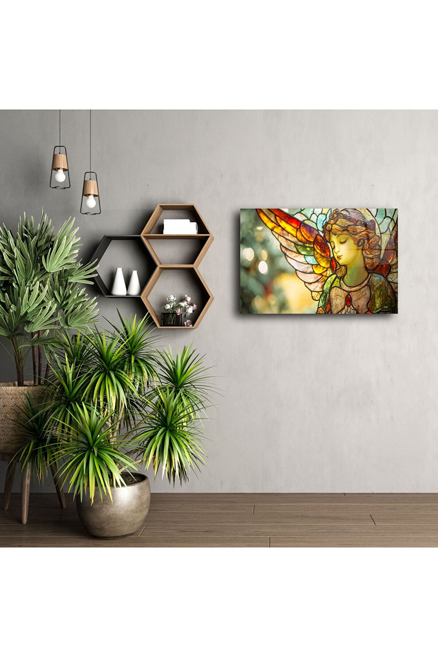 Bu narin melek figürüyle tasarlanmış vitray stil cam tablo, huzur ve zarafet arayan yaşam alanları için eşsiz bir sanatsal dokunuş sunuyor. Pastel tonlar ve cam üzerindeki ışık oyunları, her bakışta içsel bir dinginlik uyandırıyor.