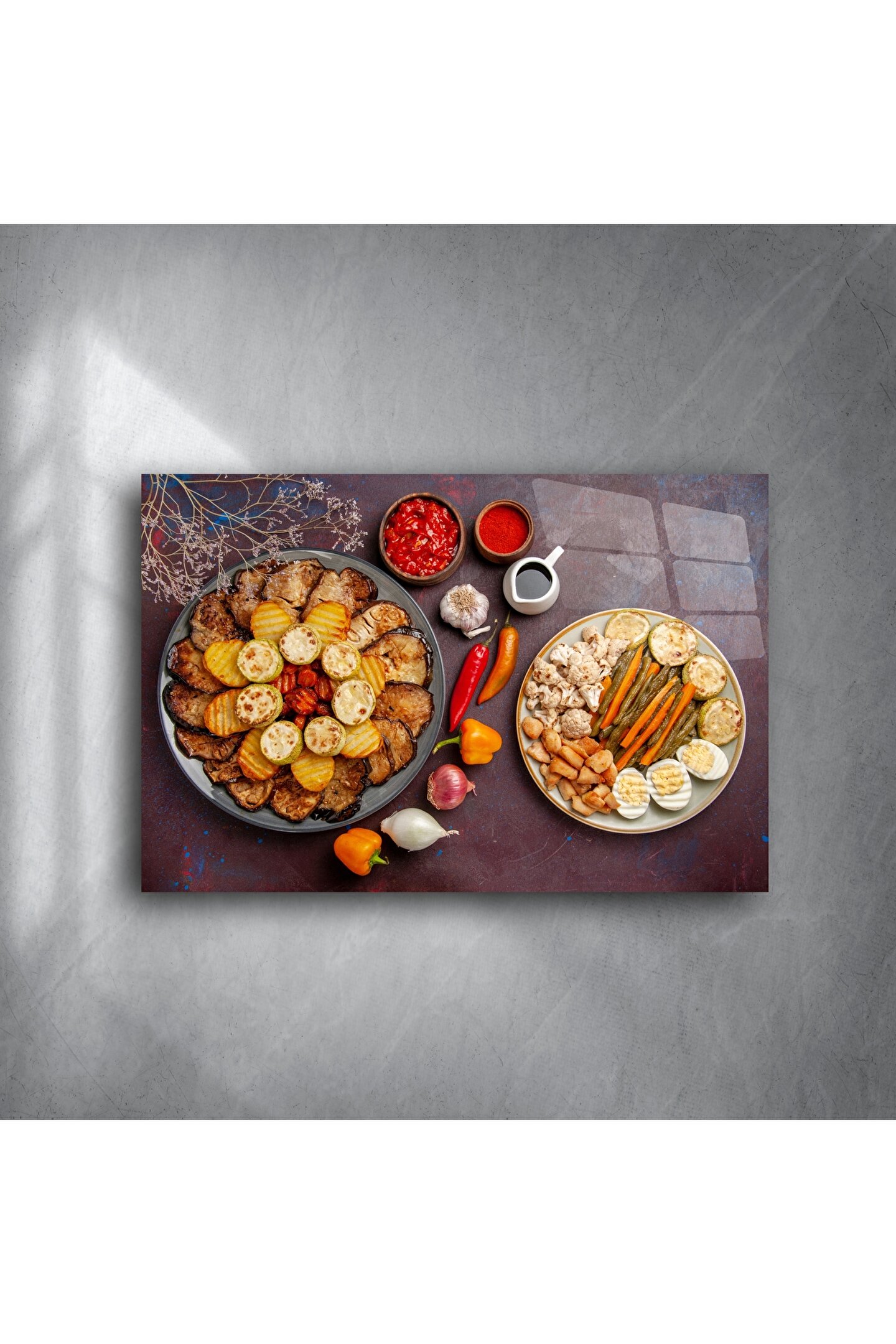 Lezzetli bir sunumun estetikle buluştuğu bu modern cam tablo, mutfaklar ve yemek alanları için eşsiz bir atmosfer yaratır. Gerçek fotoğraf kalitesindeki bu renkli baskı, zengin detayları ve canlı yemek temasıyla hem şıklık hem iştah sunar.