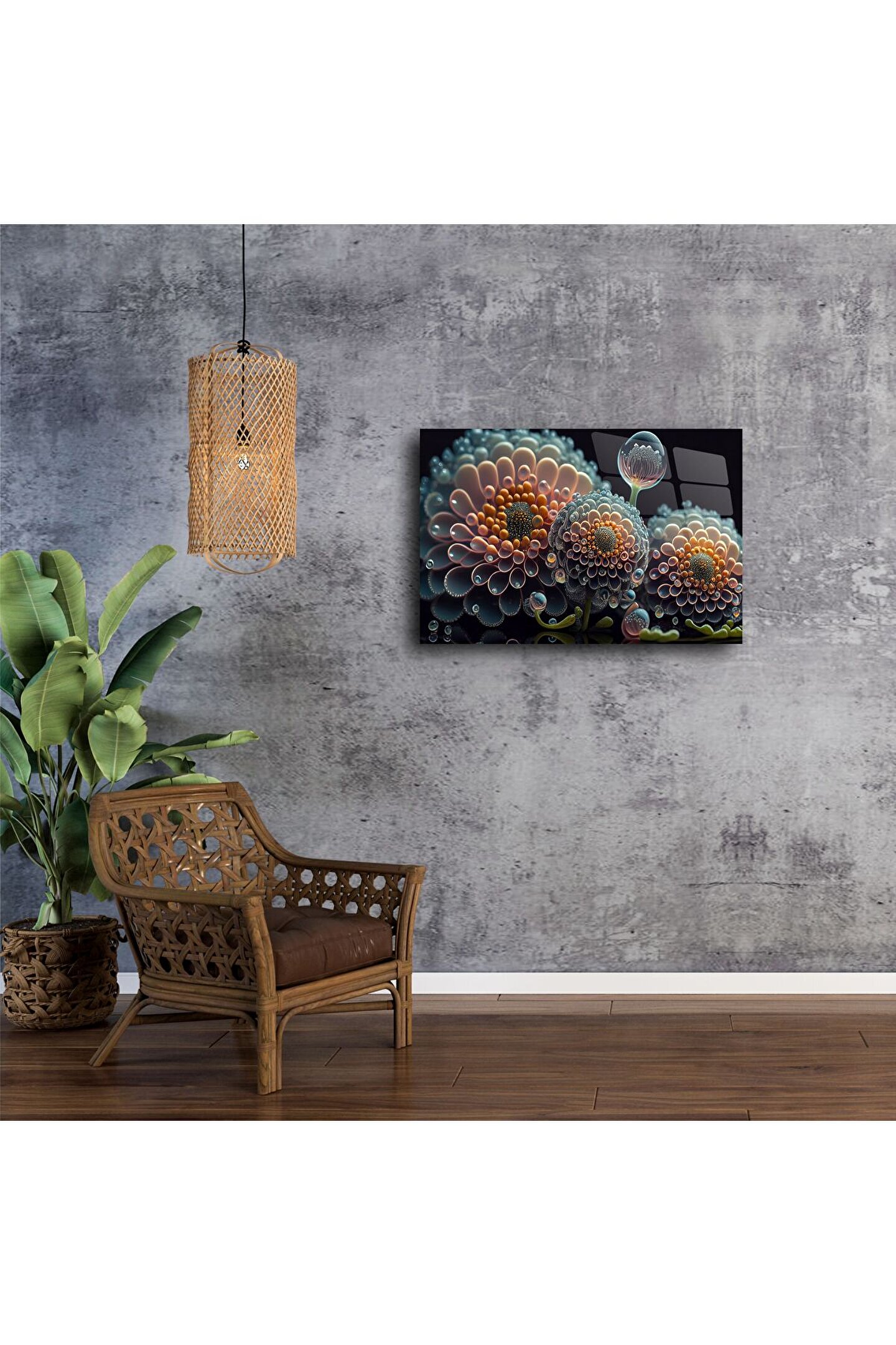 Derin dokularla bezenmiş modern çiçek tasarımlı bu cam tablo, sanatı yüksek çözünürlüklü cam yüzeyle buluşturur. 3D etkisi veren tasarımıyla duvarlarınıza sadece bir dekor değil, ruh katar. Göz alıcı detaylar, pastel ve koyu tonların dengesiyle oturma odaları, ofisler veya yatak odaları için etkileyici bir atmosfer oluşturur.