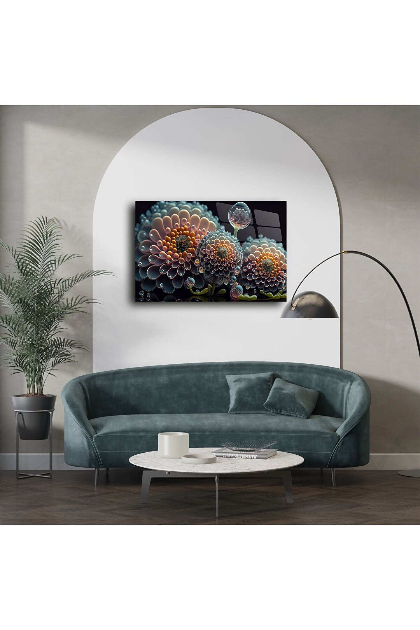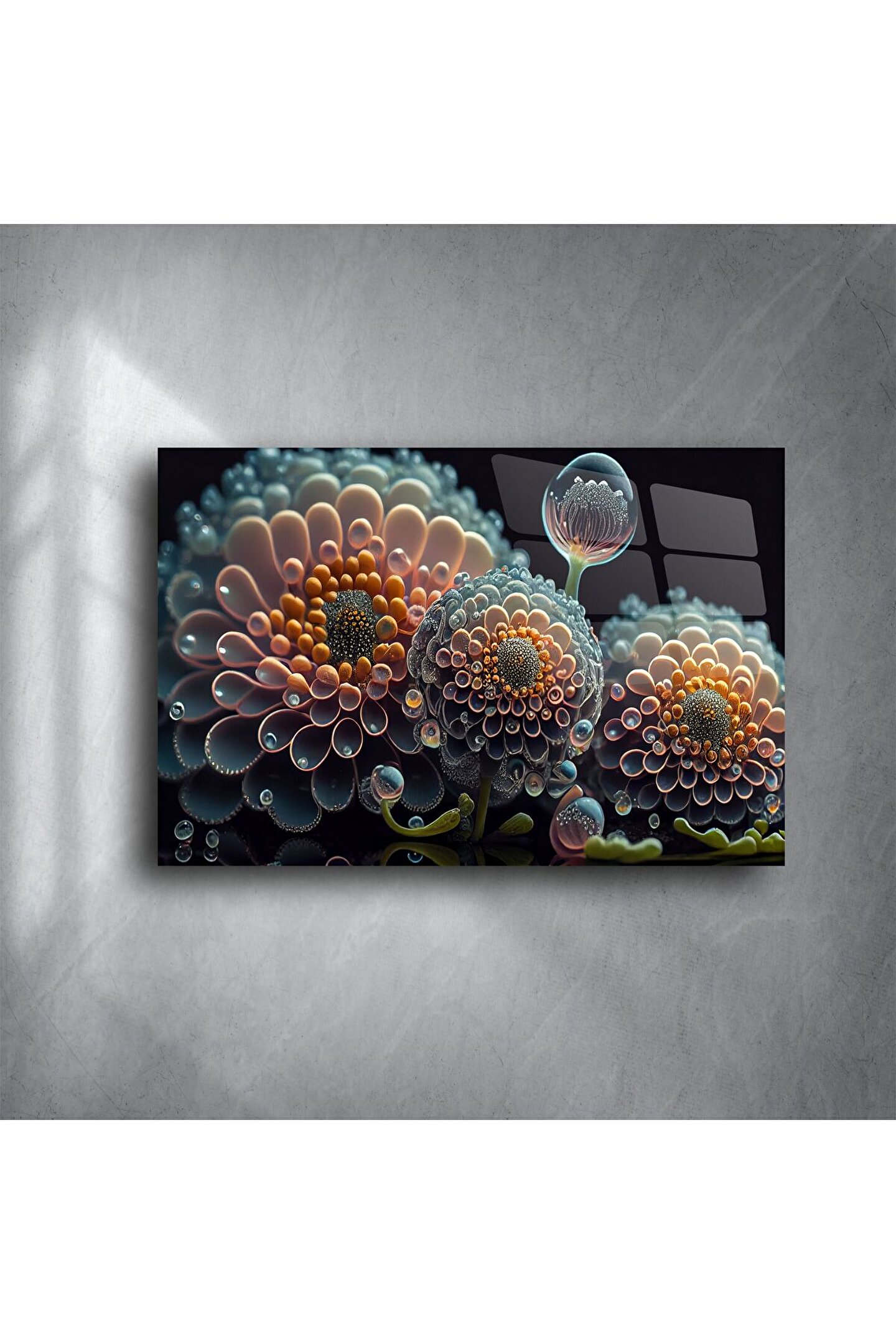 Derin dokularla bezenmiş modern çiçek tasarımlı bu cam tablo, sanatı yüksek çözünürlüklü cam yüzeyle buluşturur. 3D etkisi veren tasarımıyla duvarlarınıza sadece bir dekor değil, ruh katar. Göz alıcı detaylar, pastel ve koyu tonların dengesiyle oturma odaları, ofisler veya yatak odaları için etkileyici bir atmosfer oluşturur.
