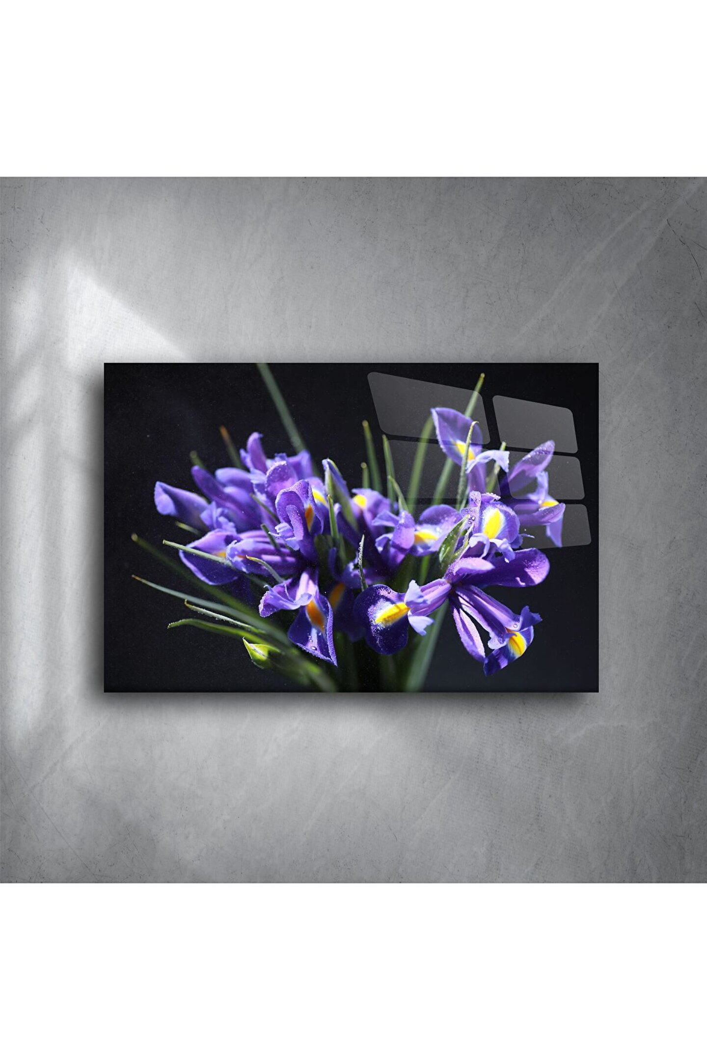 Mor iris çiçeklerinin zarif güzelliğini yaşam alanınıza taşıyın. Koyu fon üzerindeki canlı detaylar, gizemle huzuru bir araya getiriyor — doğanın ve zarafetin mükemmel uyumu.