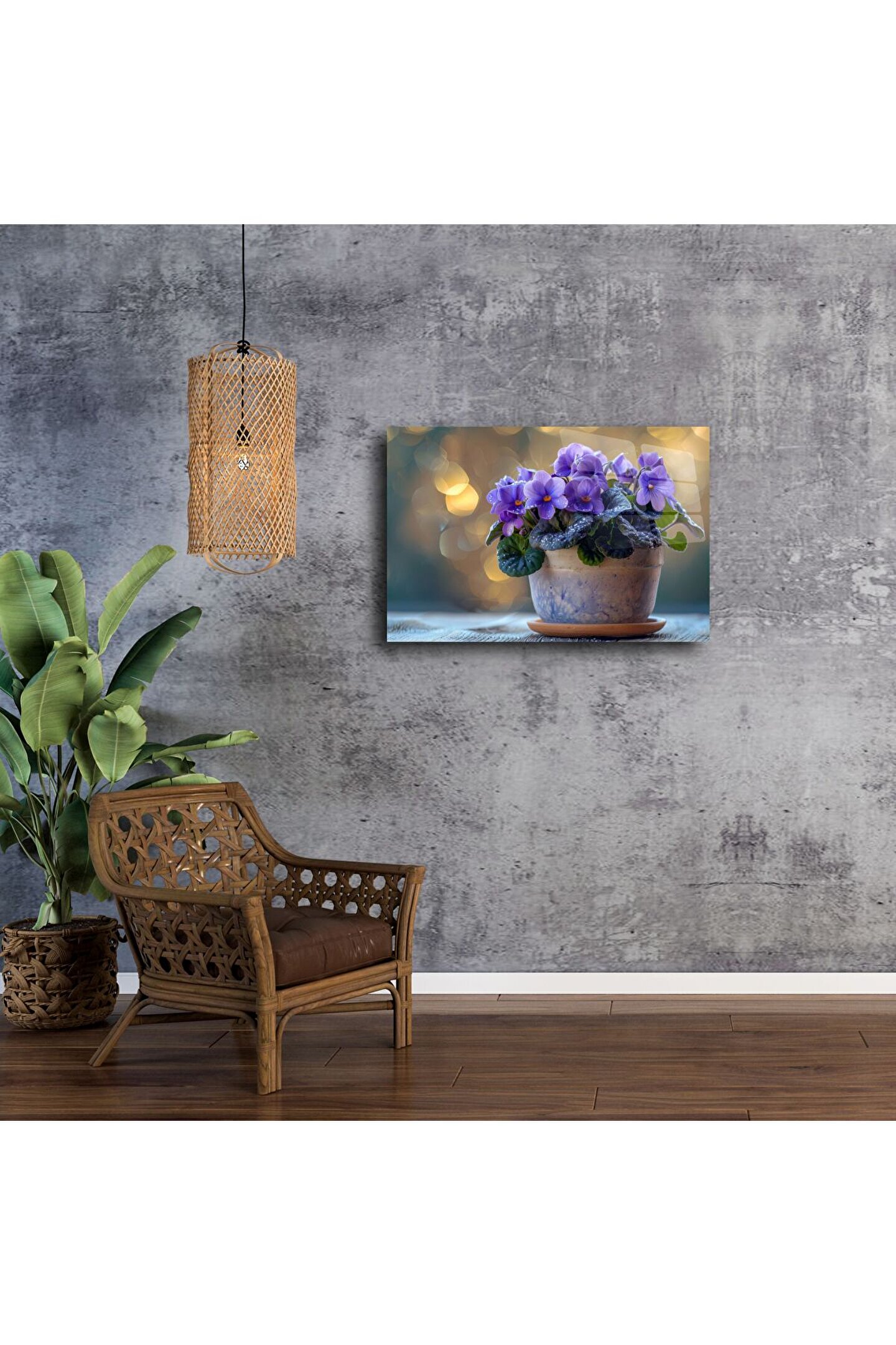 Doğanın zarifliğini ve huzurunu evinize taşıyın. Bu cam tablo, canlı mor menekşeler ve ışıl ışıl bokeh arka planıyla hem doğaya hem de sanata duyulan sevgiyi yansıtıyor. Yüksek çözünürlüklü baskı ve parlak cam yüzey, her detayı ön plana çıkarırken mekanınıza modern bir şıklık katar.