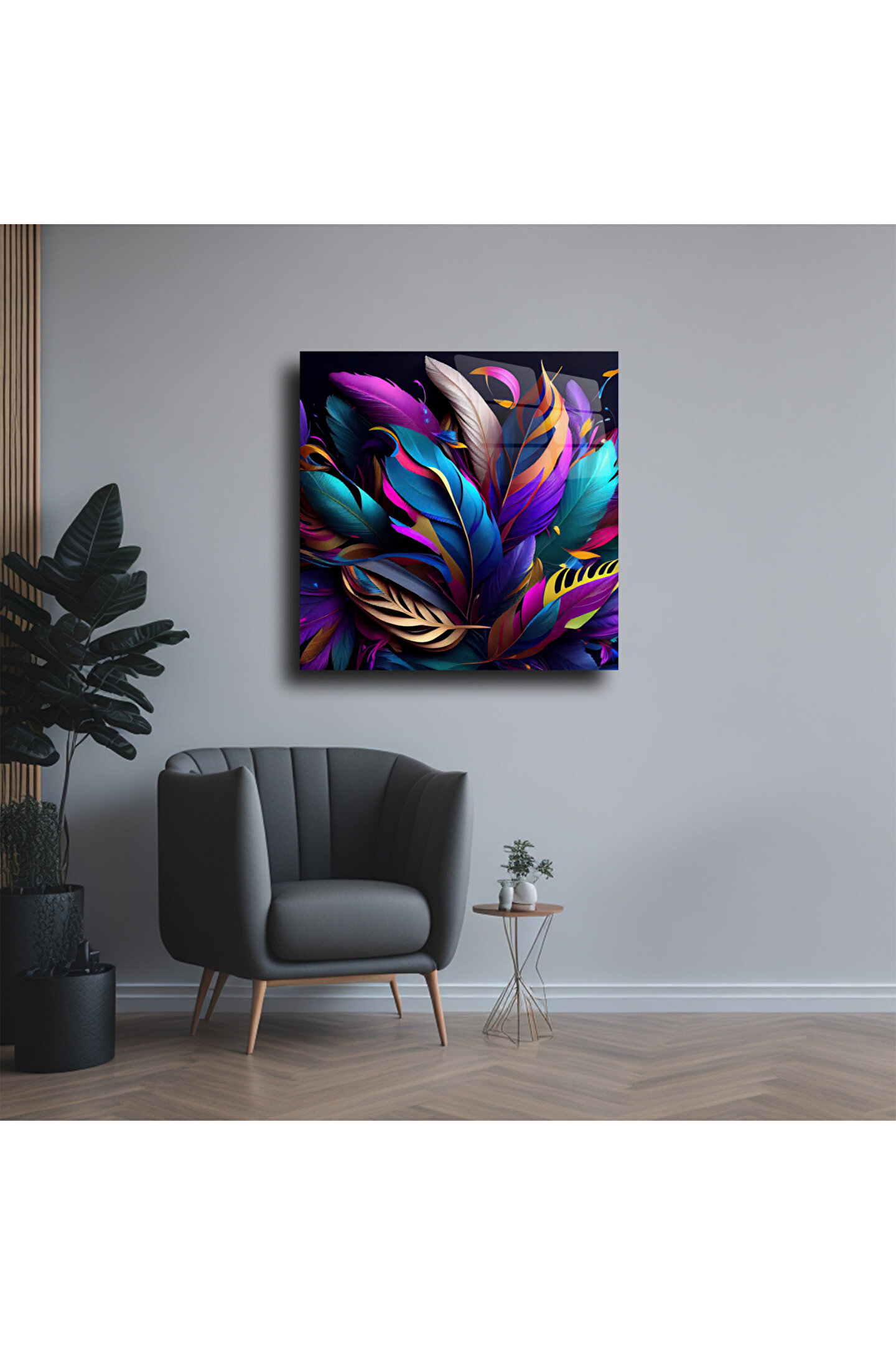 LEYLASER Mor Renk Tüyler ve Yapraklar Cam Tablo Duvar Dekoru