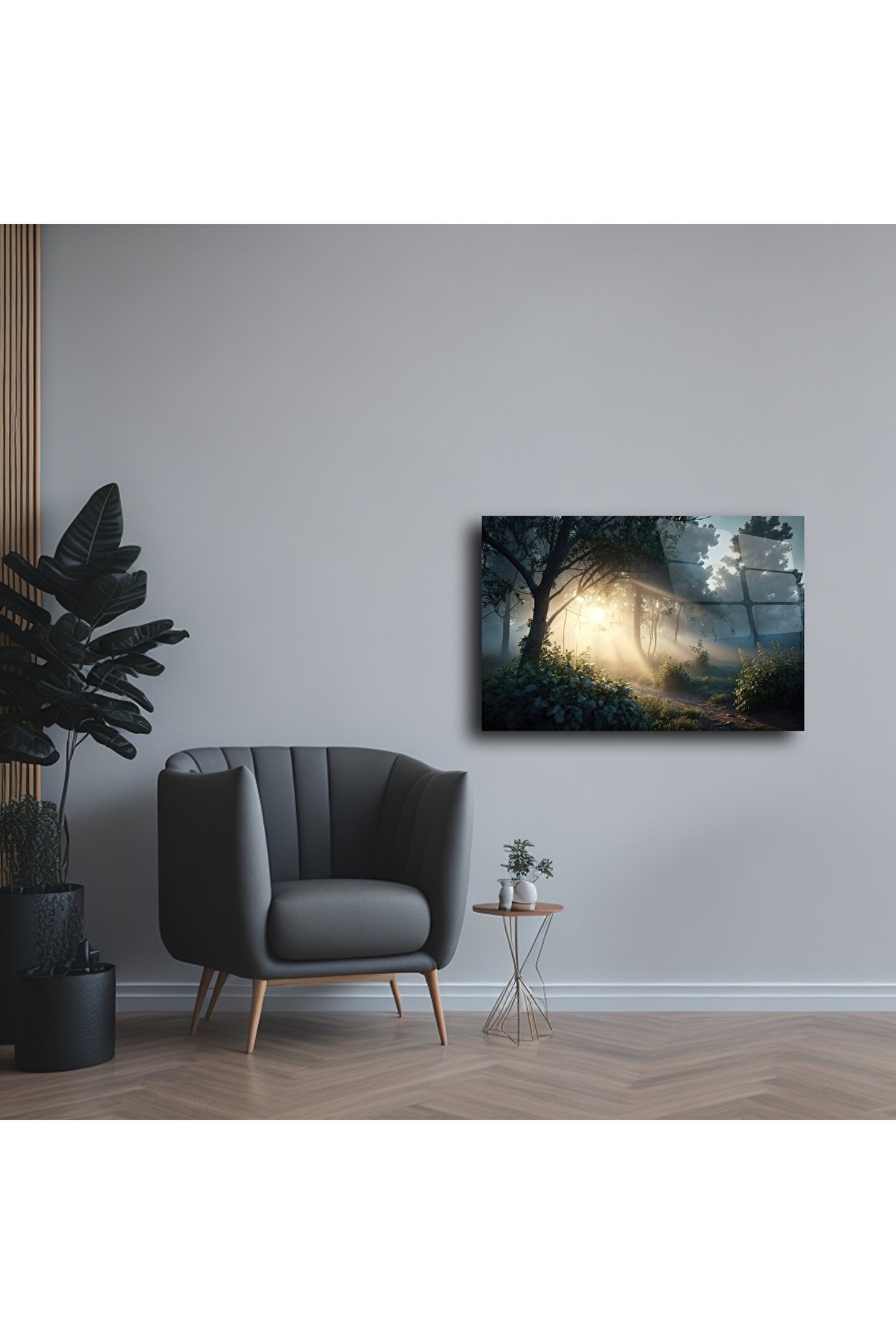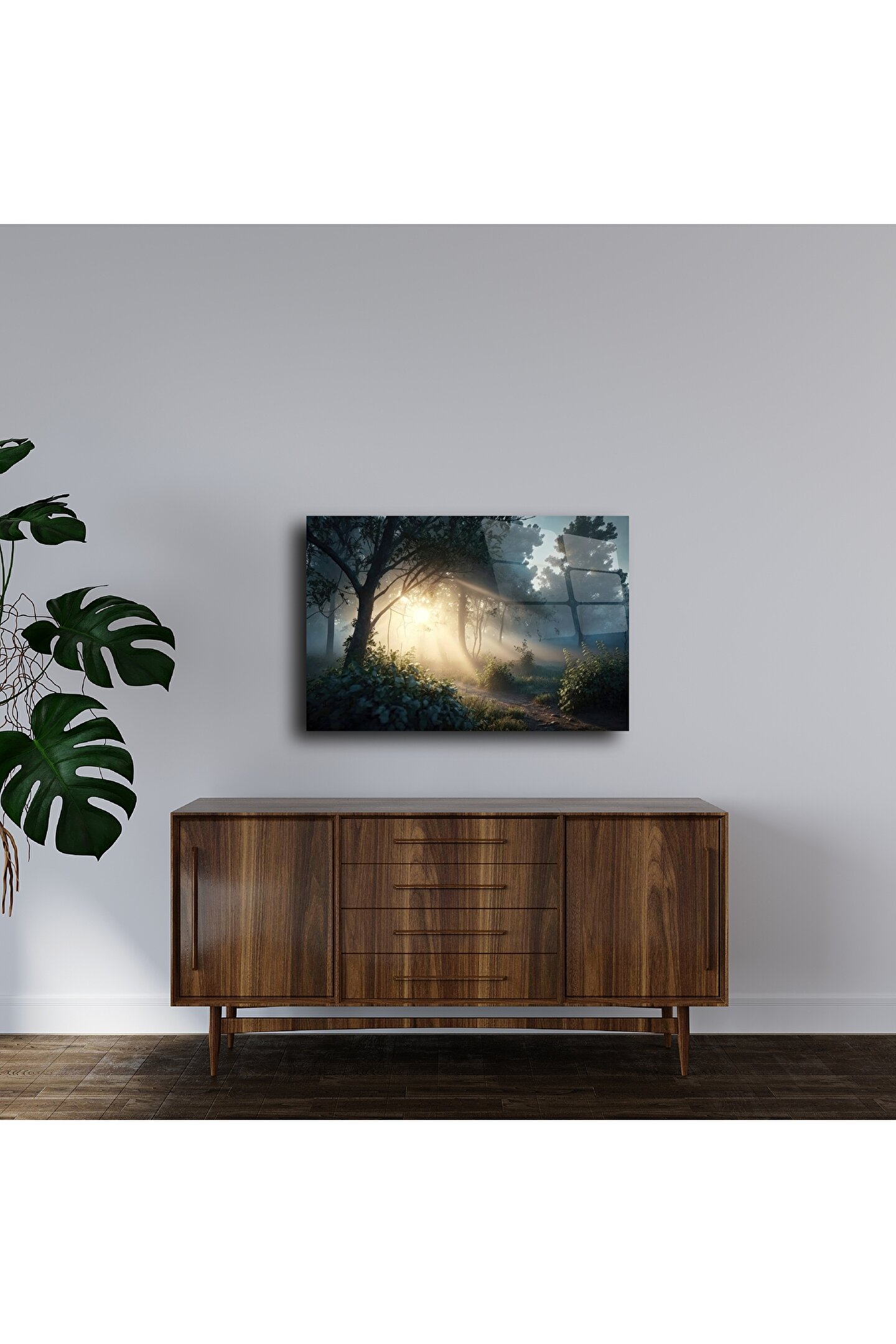 Orman Işık Patikası cam tablosu, güneş ışığının sabah sisiyle buluştuğu büyüleyici bir orman manzarasını cam üzerine yansıtır. Doğanın zarif dokunuşuyla evinize huzur, tazelik ve ilham dolu bir atmosfer kazandırır.
