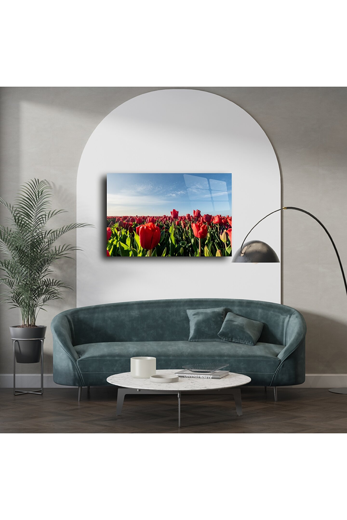 Doğanın en zarif dokunuşu olan kırmızı lale tarlasının büyüleyici manzarası, ultra net cam yüzeye yansıtılarak yaşam alanınıza zarafet getiriyor. Bu doğa manzaralı cam tablo, baharın enerjisini ve huzurunu duvarlarınıza taşırken, modern ve minimalist dekorasyonlara sofistike bir dokunuş ekler.