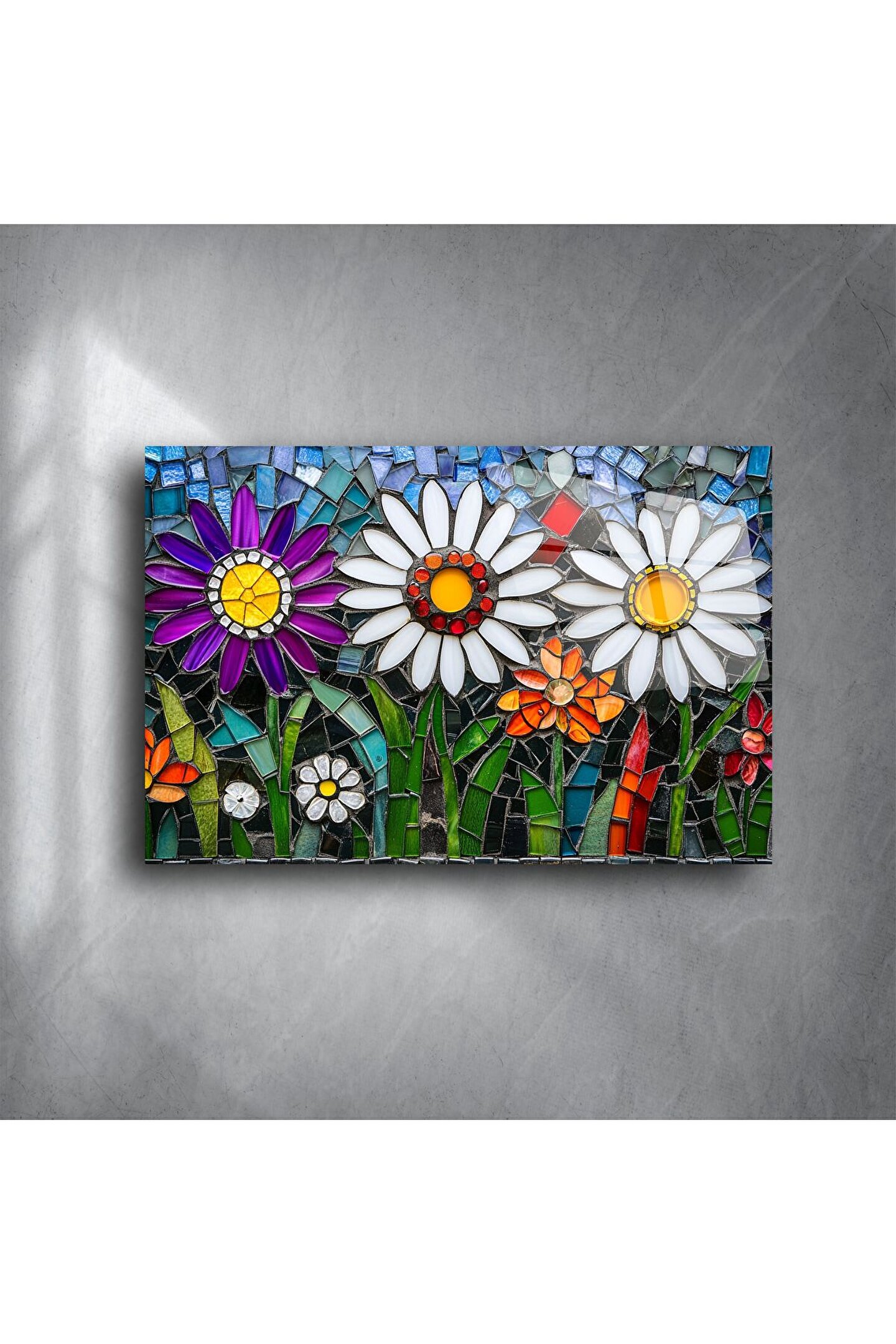 Doğanın sade güzelliğini renkli cam sanatıyla buluşturan bu papatya desenli mozaik cam tablo, iç mekanlarınıza baharın ferahlığını taşır. Beyaz, mor, turuncu ve sarının camda hayat bulduğu bu özel tasarım; pozitif enerji, canlılık ve zarafeti bir arada sunar.