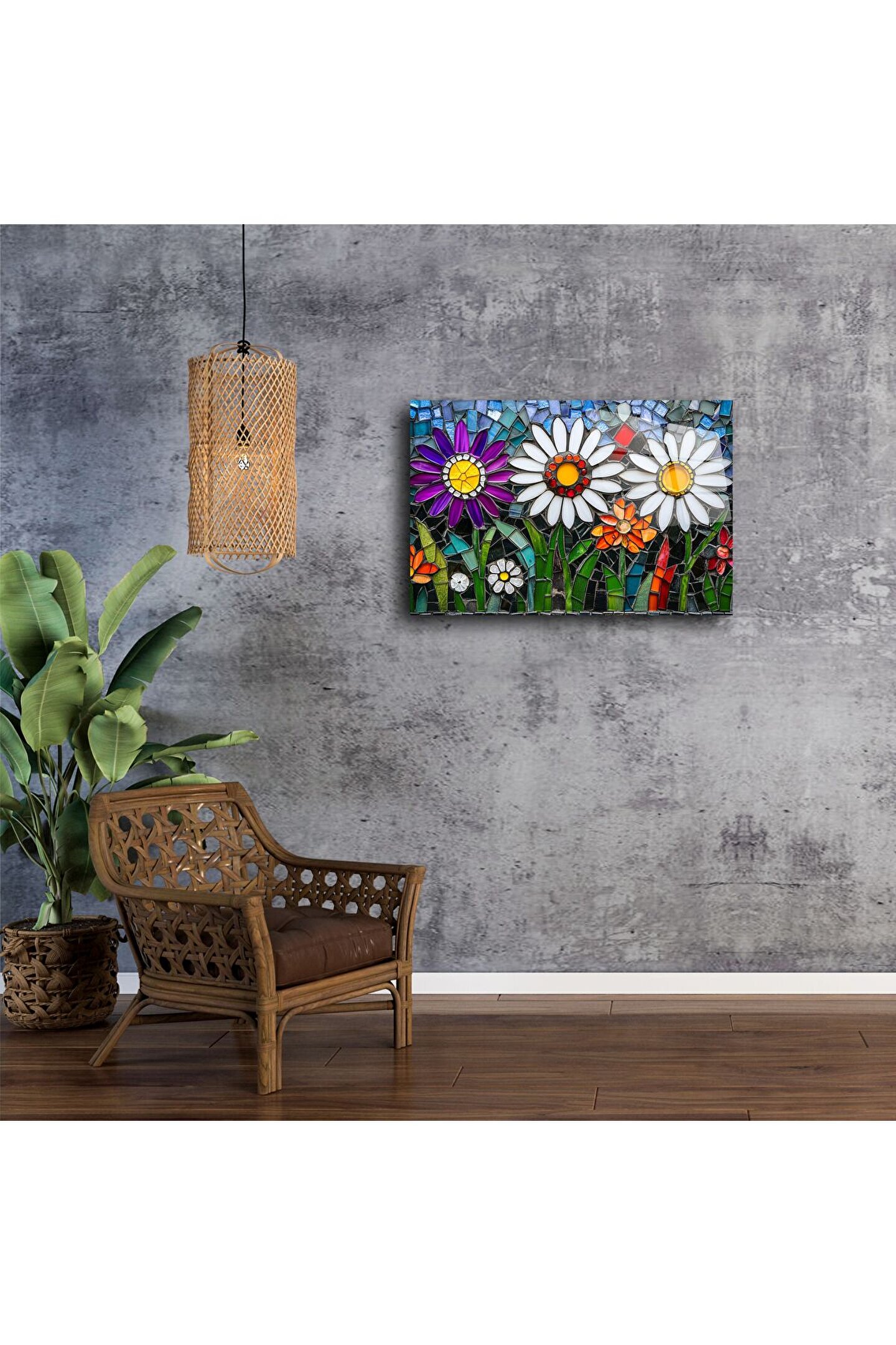 Doğanın sade güzelliğini renkli cam sanatıyla buluşturan bu papatya desenli mozaik cam tablo, iç mekanlarınıza baharın ferahlığını taşır. Beyaz, mor, turuncu ve sarının camda hayat bulduğu bu özel tasarım; pozitif enerji, canlılık ve zarafeti bir arada sunar.