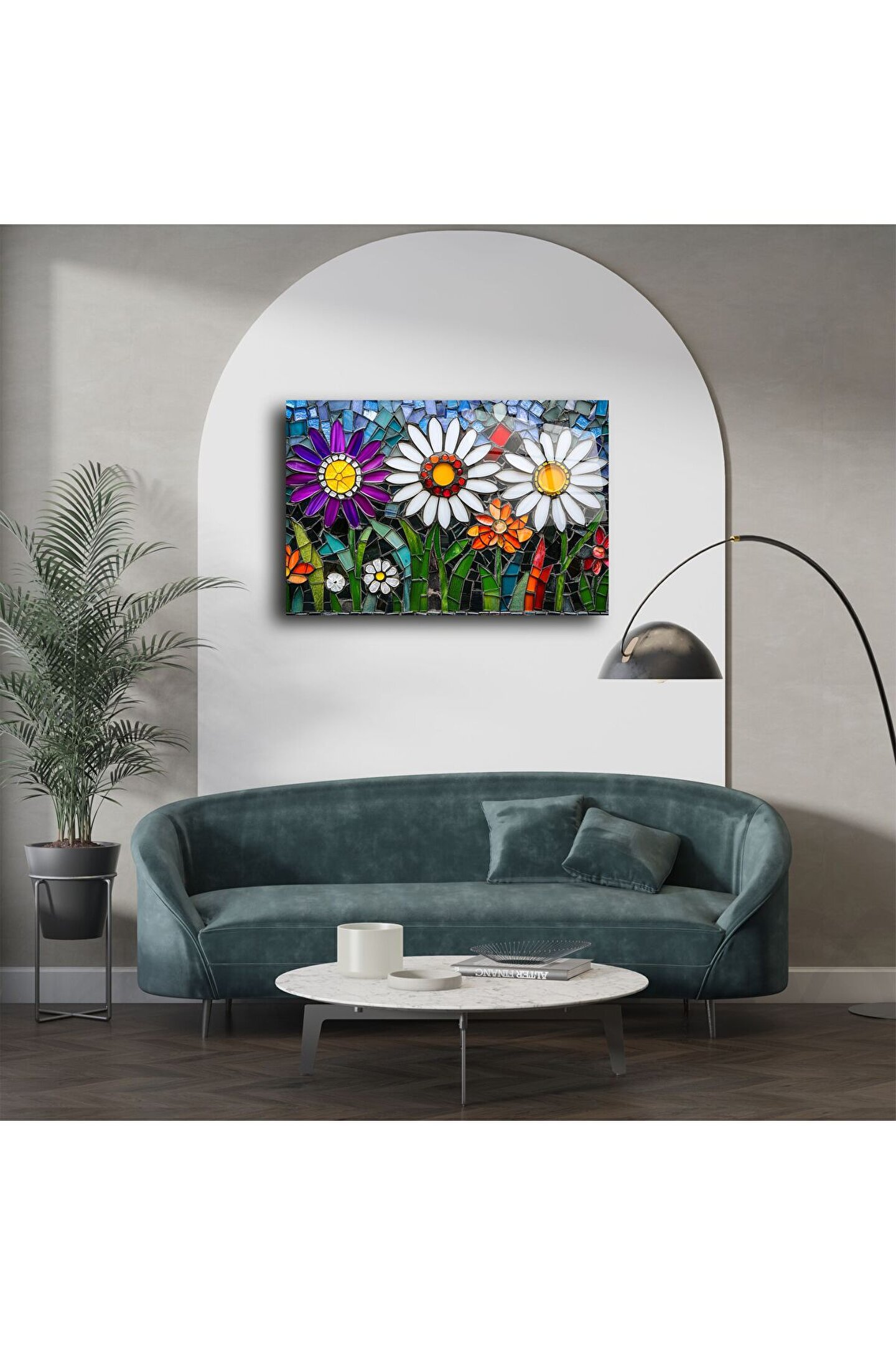 Doğanın sade güzelliğini renkli cam sanatıyla buluşturan bu papatya desenli mozaik cam tablo, iç mekanlarınıza baharın ferahlığını taşır. Beyaz, mor, turuncu ve sarının camda hayat bulduğu bu özel tasarım; pozitif enerji, canlılık ve zarafeti bir arada sunar.