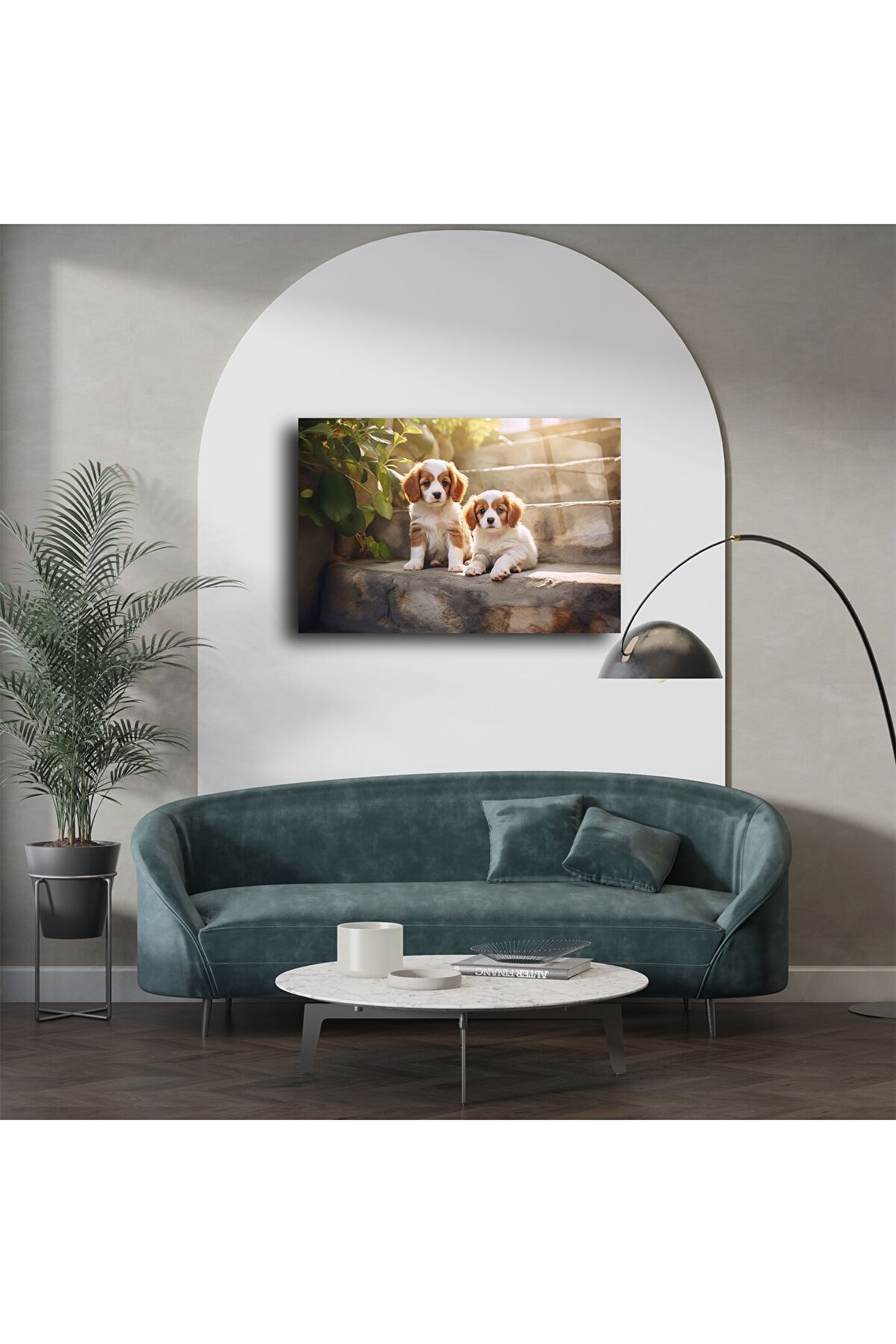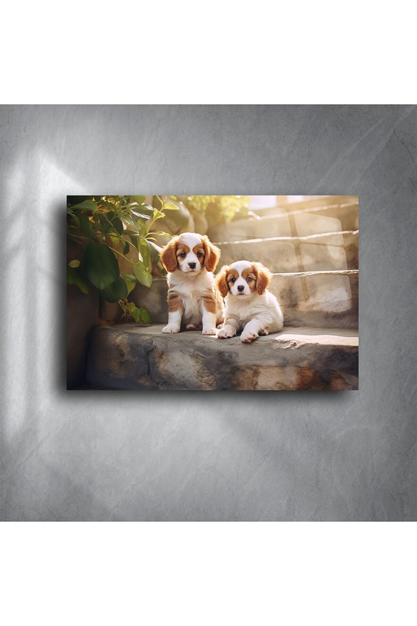 Sabah güneşinin tadını çıkaran iki sevimli spaniel yavrusunu gösteren bu parlak akrilik duvar sanatıyla evinize neşe katın. Oynarken poz verdikleri taş basamaklar, her mekâna sıcaklık ve mutluluk getiren kalpleri ısıtan bir sahne sunar. Yüksek kaliteli akrilik üzerine basılan bu görsel, canlı renk derinliği, netlik ve modern bir parlak yüzey sunar.