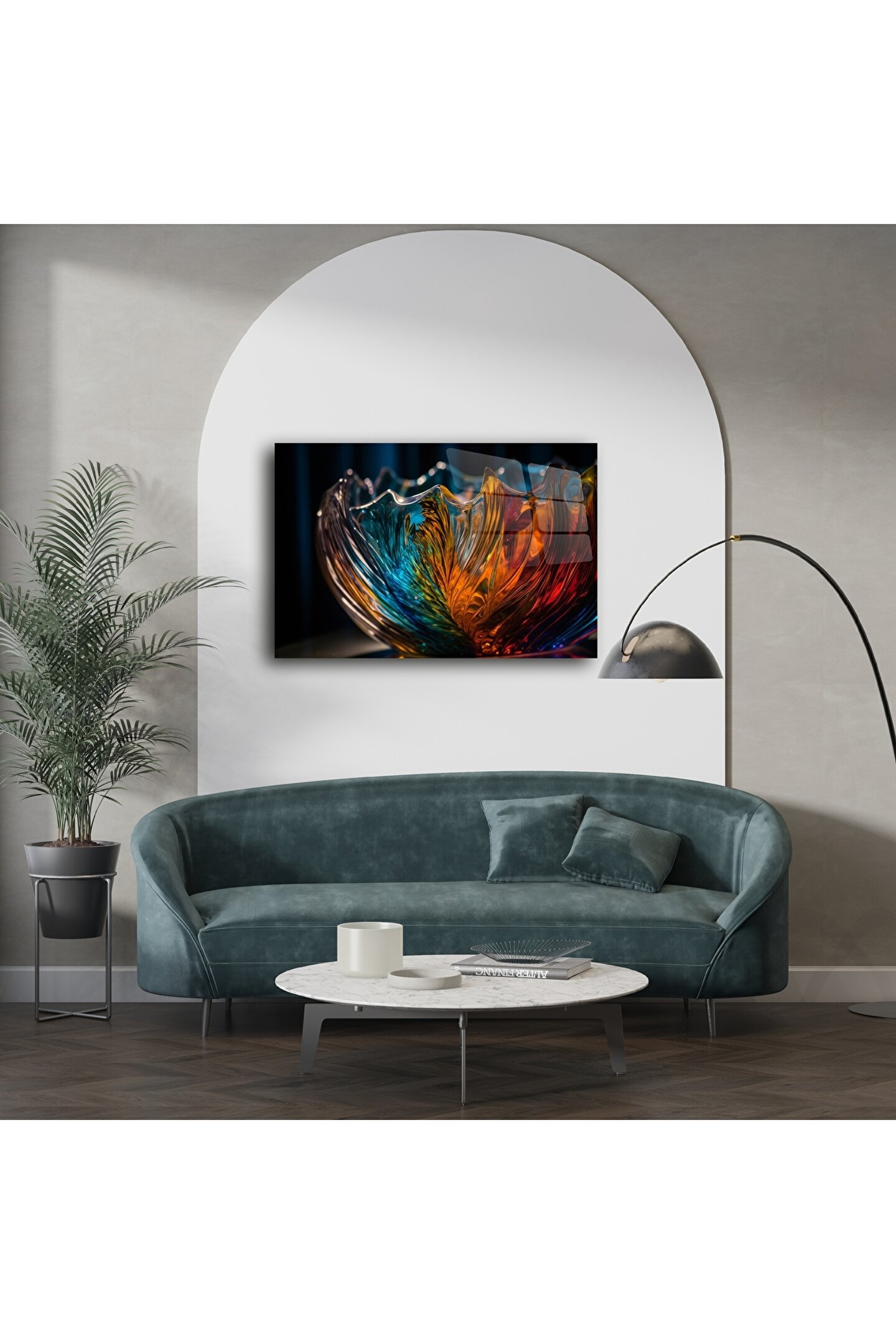 Eşsiz bir estetik formda şekillenen bu cam tablo, zarif dalga yapıları ve renklerin akışkan uyumuyla ev dekorasyonunuza lüks bir imza atıyor. Turuncudan maviye, kırmızıdan sarıya uzanan renk geçişleri, göz alıcı cam kase detaylarıyla birleşerek üç boyutlu bir sanat şöleni sunuyor.