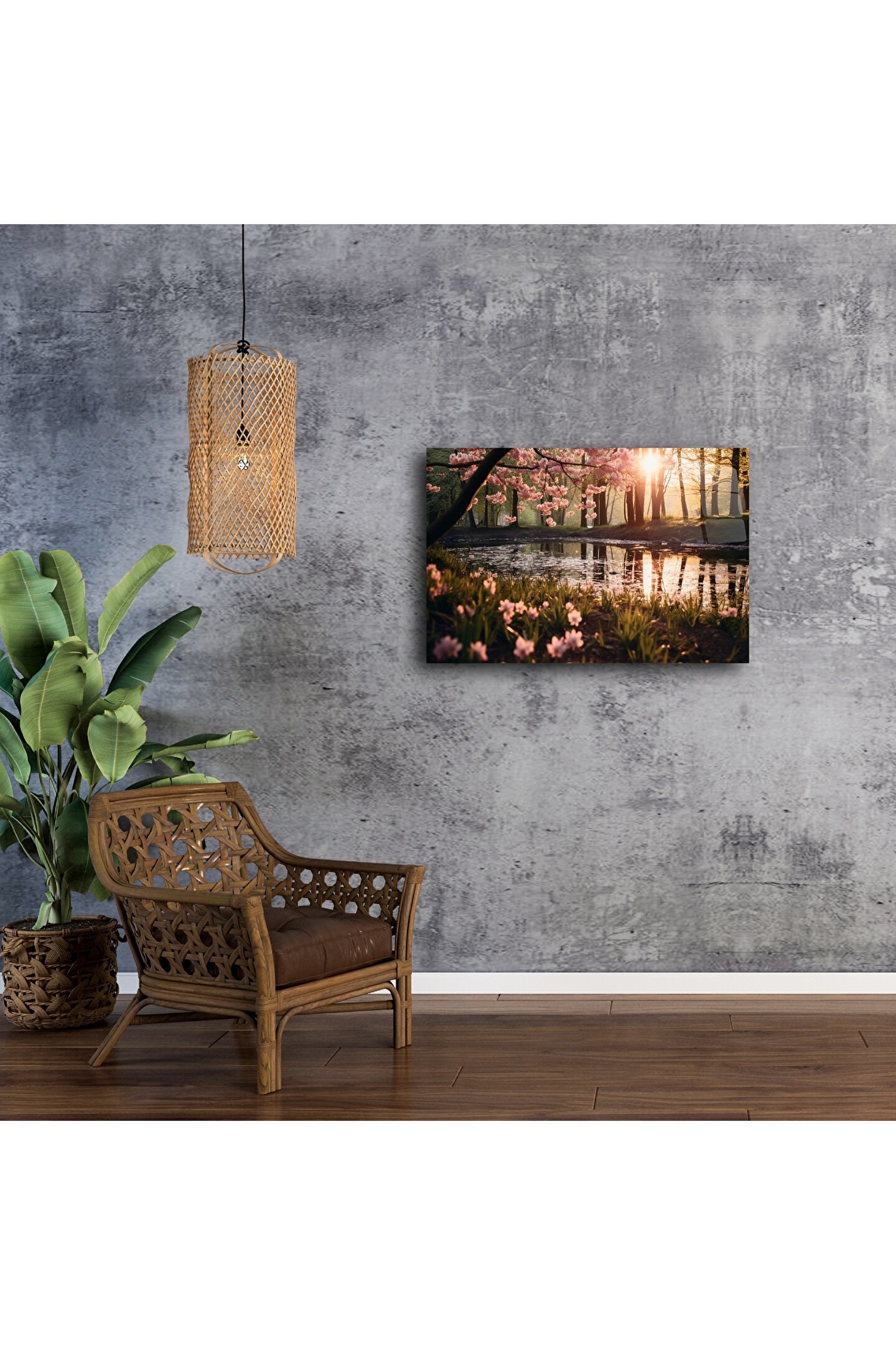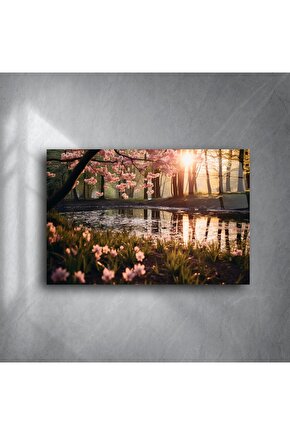 Sakinliği ve zarafeti duvarlarınıza taşıyın. Bu "Premium Bahar Manzarası Metal Duvar Sanatı", pembe kiraz çiçekleriyle bezenmiş huzurlu bir göl kenarını, altın gün batımı ışığında yansıtarak evinize romantik bir dokunuş katar.