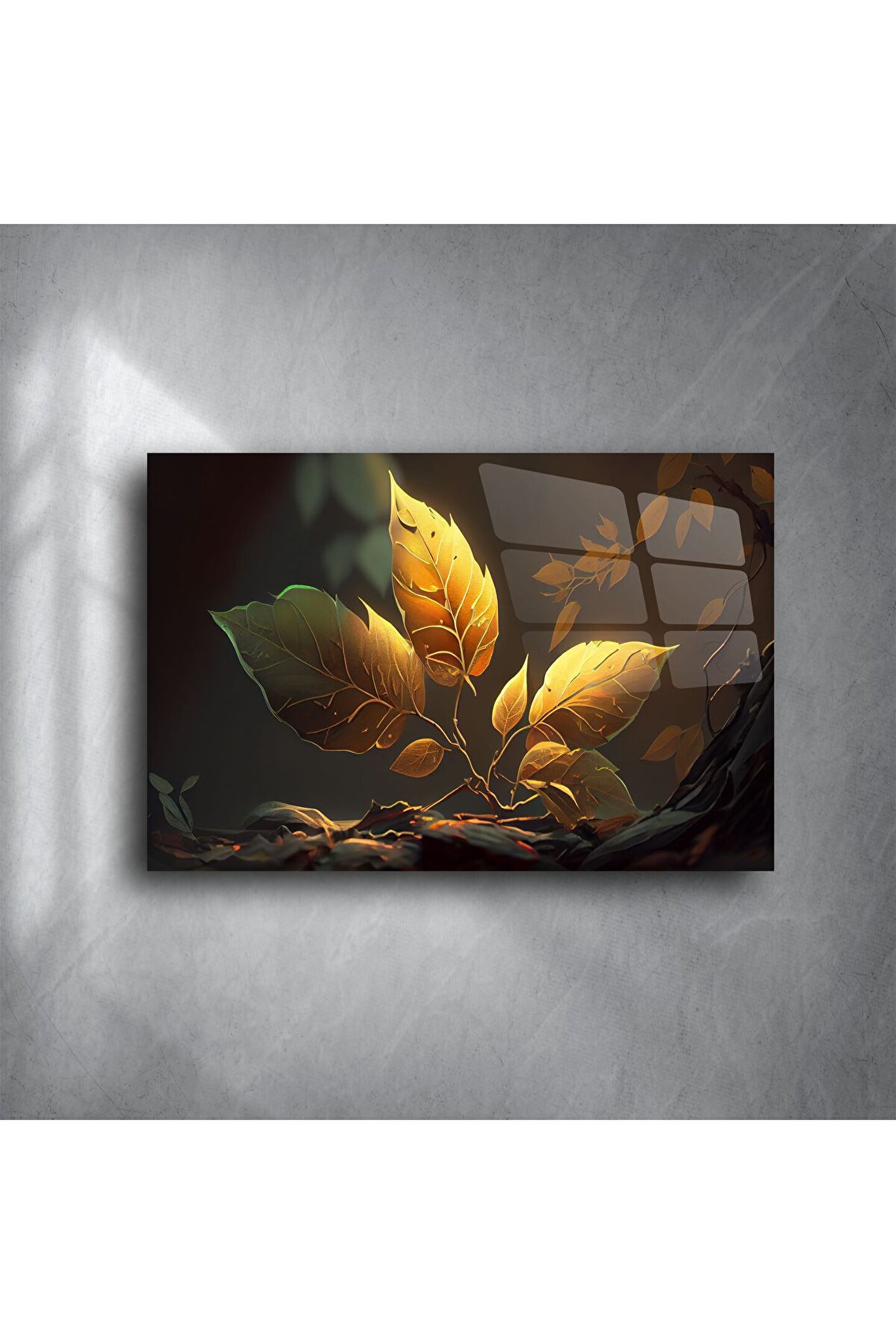 Zarif ve güçlü bir doğa simgesi olan altın yapraklar, ışıkla dans eden bu cam tablo üzerinde hayat buluyor. Gerçek cam panel üzerine yüksek çözünürlüklü olarak basılan bu yaprak sanatı, modern doğa temalı dekorun en estetik halini sunuyor.