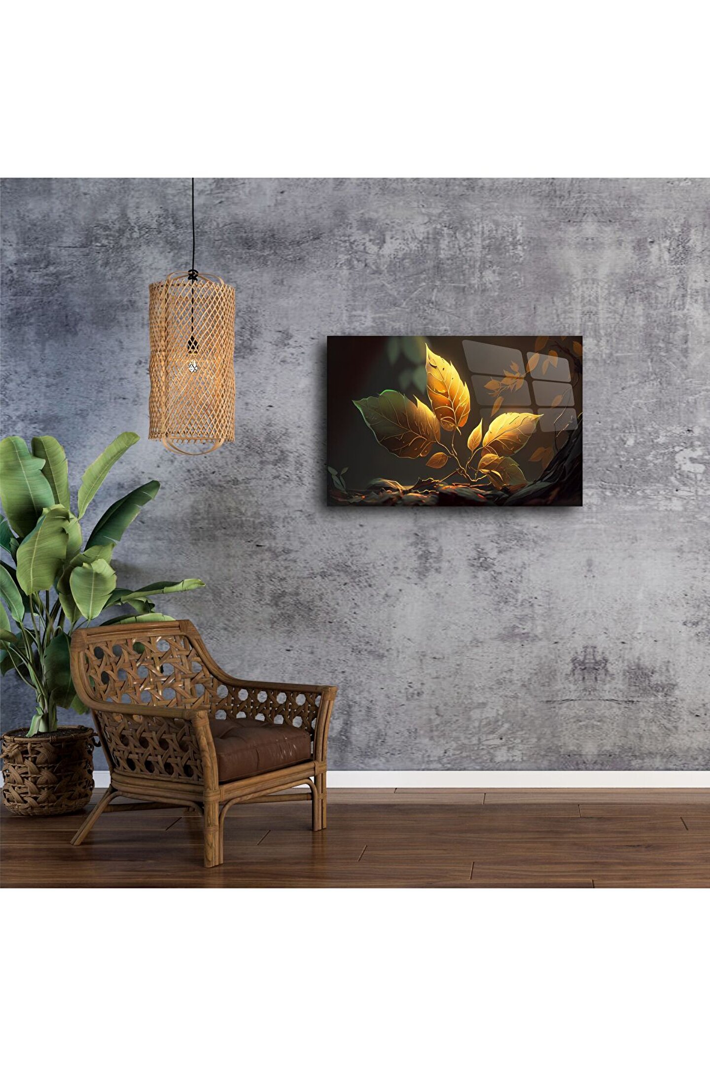 Zarif ve güçlü bir doğa simgesi olan altın yapraklar, ışıkla dans eden bu cam tablo üzerinde hayat buluyor. Gerçek cam panel üzerine yüksek çözünürlüklü olarak basılan bu yaprak sanatı, modern doğa temalı dekorun en estetik halini sunuyor.