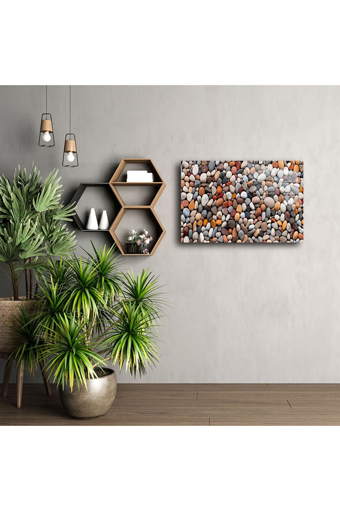 Bu renkli çakıl taşları desenli cam tablo, doğanın denge ve huzur veren enerjisini iç mekânlarınıza taşır. Her biri farklı renk ve dokudaki yumuşak formlu taşlar, sakinleştirici bir atmosfer yaratırken mekânlara doğal bir canlılık kazandırır. Yüksek çözünürlüklü baskı ile temperli cam yüzeyde birleşen bu tasarım, şıklığı ve sadeliği bir arada sunar.
