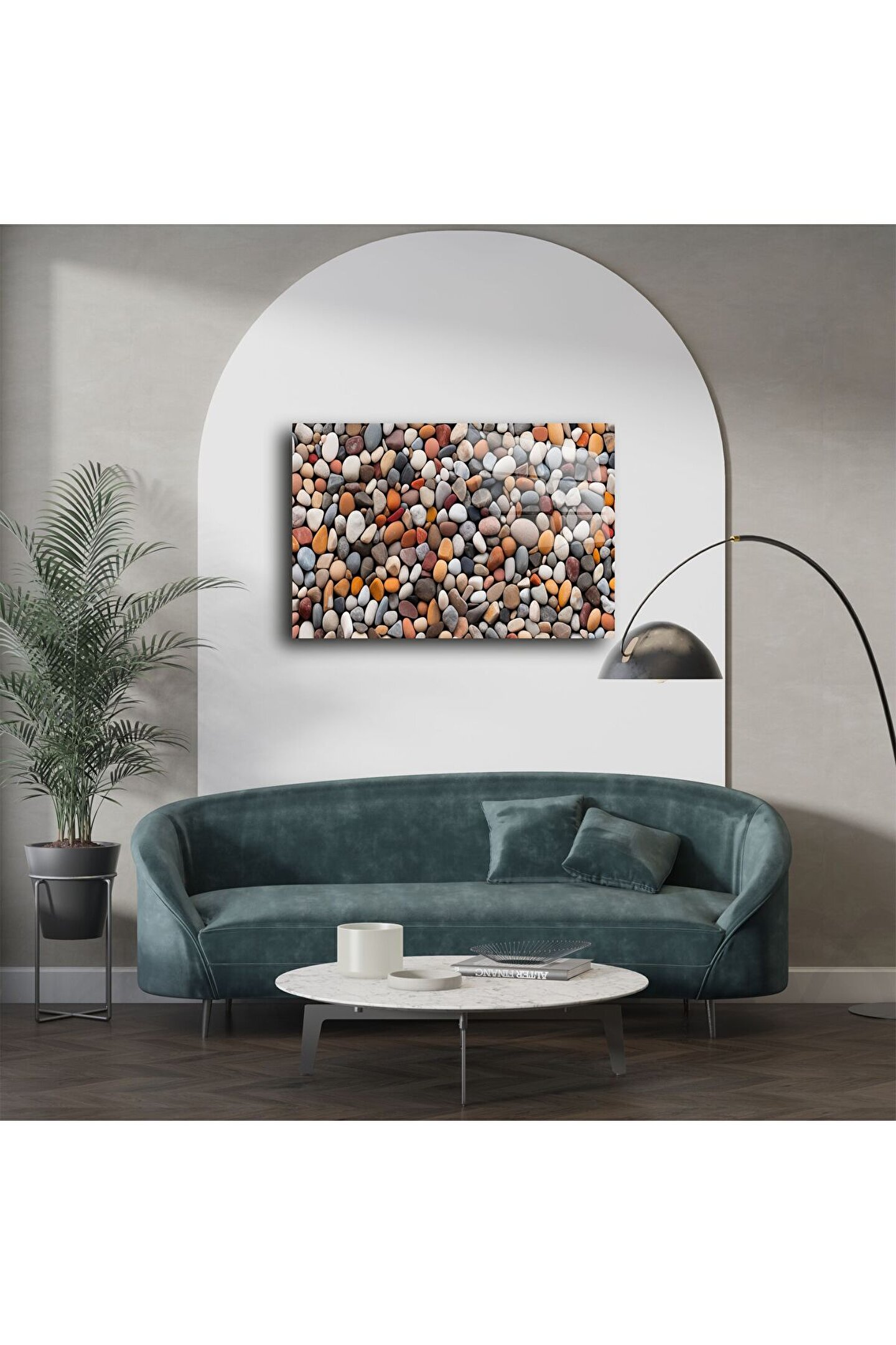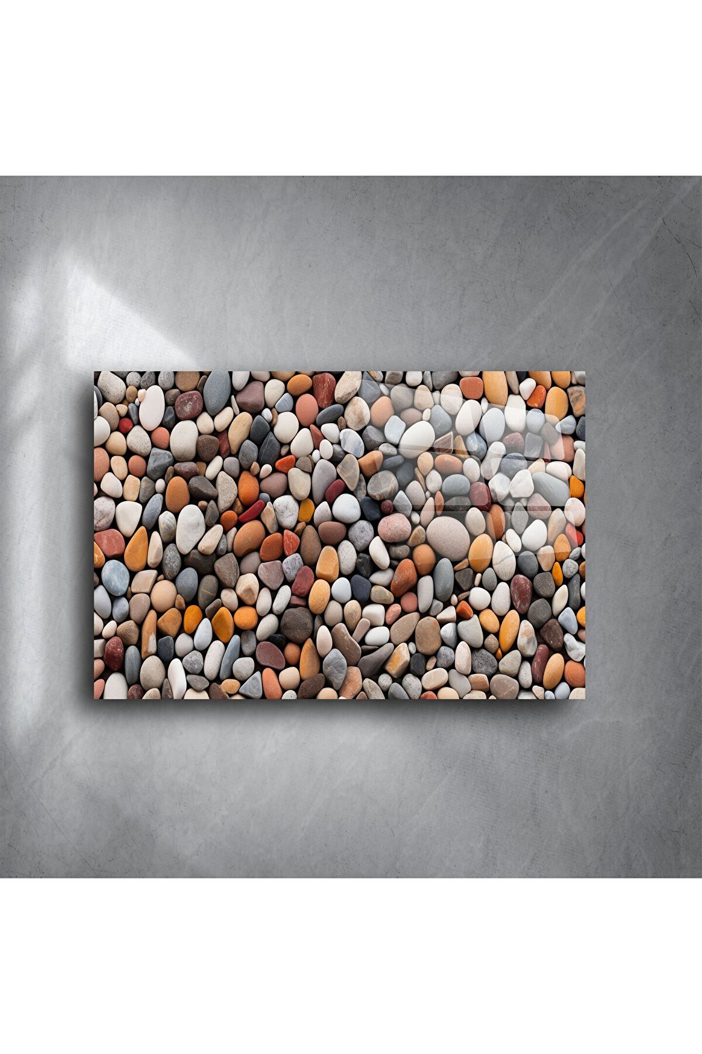 Bu renkli çakıl taşları desenli cam tablo, doğanın denge ve huzur veren enerjisini iç mekânlarınıza taşır. Her biri farklı renk ve dokudaki yumuşak formlu taşlar, sakinleştirici bir atmosfer yaratırken mekânlara doğal bir canlılık kazandırır. Yüksek çözünürlüklü baskı ile temperli cam yüzeyde birleşen bu tasarım, şıklığı ve sadeliği bir arada sunar.
