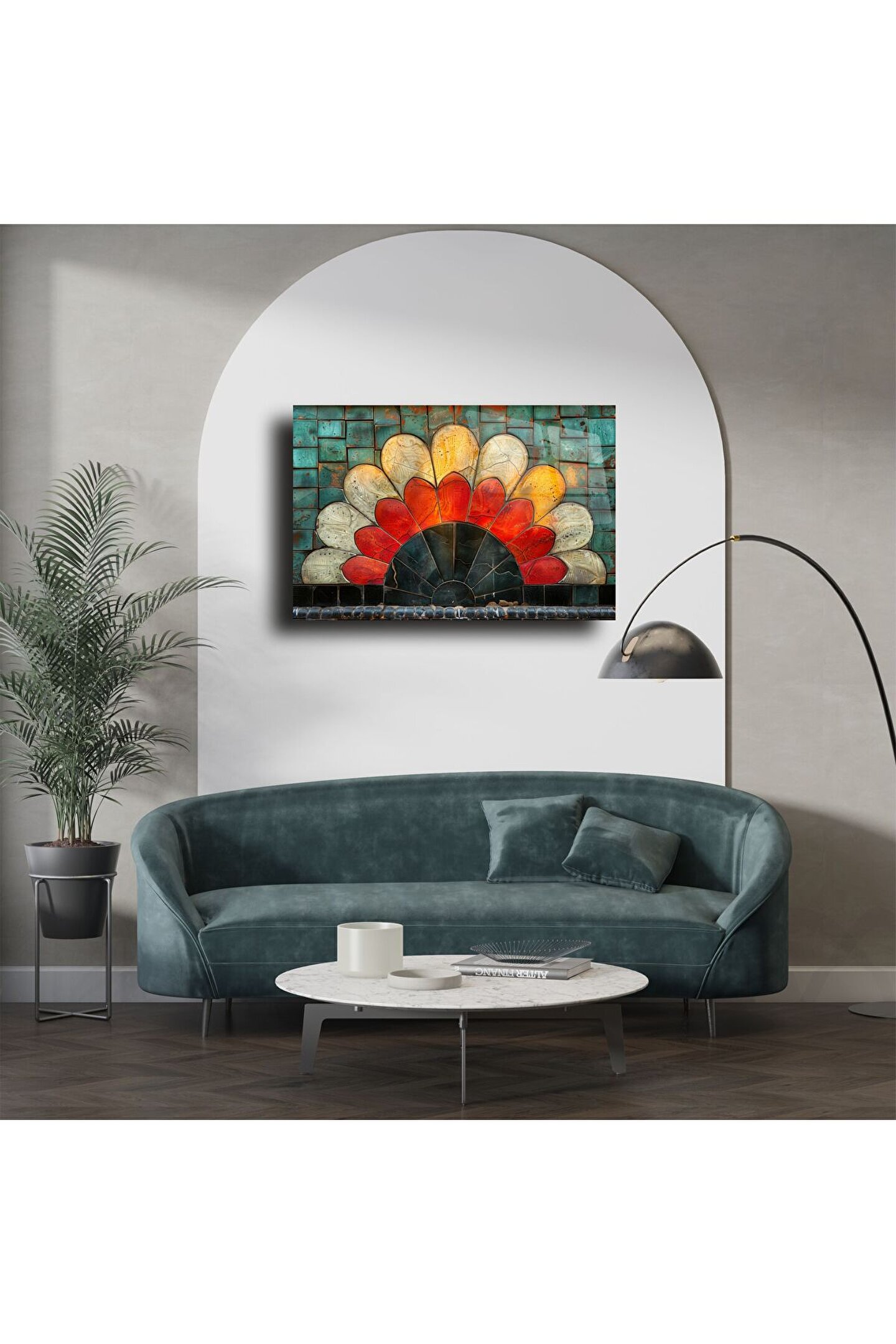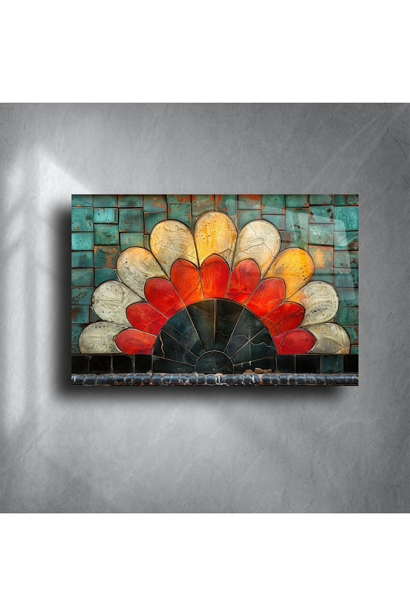 Bu renkli cam mozaik çiçek tablo, yaşam alanınıza neşe ve enerji katmak için ustalıkla elde üretildi. Işıltılı vitray camlarla hazırlanan bu eser; kırmızı, sarı, mavi ve yeşilin göz alıcı tonlarıyla çiçekleri adeta canlandırıyor. Her yaprak, her detay zarif bir işçiliğin parçası.