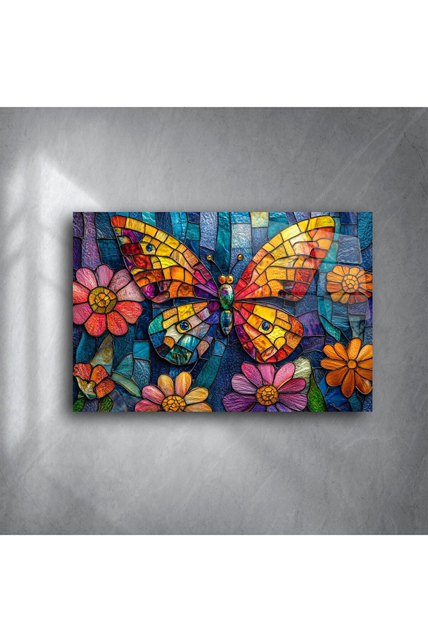 El yapımı cam mozaik kelebek duvar sanatı, doğal taşların ışıltısı ve canlı cam renklerinin buluşmasıyla öne çıkıyor. Bu tablo, kelebek ve çiçeklerin simgelediği yeniden doğuşu, umudu ve pozitif enerjiyi evinize taşıyor. Her parça, usta eller tarafından tek tek yerleştirilen cam mozaiklerden oluşur ve ışıkla büyüleyici bir dans yaratır.